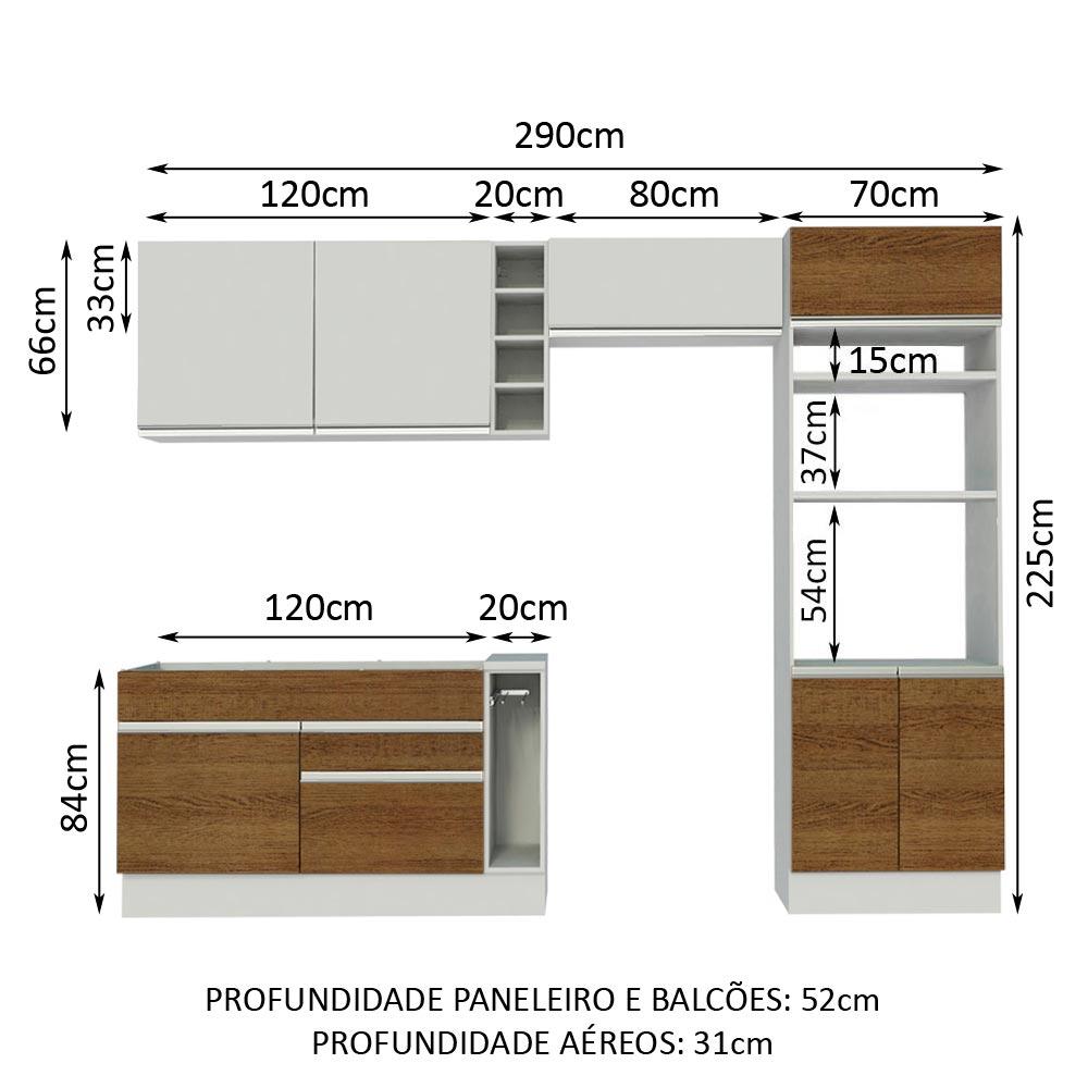 Fabricada com materiais de qualidade superior e com design seguindo tendências modernas, a Cozinha Cristal da linha Glamy da Madesa é uma grande opção para tornar o seu ambiente mais bonito e funcional.As gavetas contam com corrediças telescópicas e todas as portas possuem dobradiças com amortecimento para o fechamento suave. Além disso, todos os módulos são separados, assim você tem a possibilidade de montar a cozinha dos seus sonhos, conforme a necessidade do seu espaço.O balcão comporta pias de 120 cm x 52 cm. Todos os módulos inferiores possuem também pés reguláveis e rodapé removível.As medidas totais da cozinha são: 290 cm de largura x 225 cm de altura. A profundidade é de 52 cm nos balcões e no paneleiro e 31 cm nos aéreos.O acabamento de toda a cozinha é branco, com exceção das portas da torre e das portas e frentes das gavetas do balcão, que possuem pintura no padrão amadeirado Rustic. O processo é feito em Poliéster Protetor ecológico de alta resistência, que protege o móvel dos efeitos da água, do álcool e do calor.Esta cozinha pode ser complementada pelos módulos avulsos da linha Glamy da Madesa.(As imagens são meramente ilustrativas: os eletros, o tampo da pia, a torneira e a decoração não acompanham o produto.)Itens inclusos:- Um (1) balcão de pia com duas (2) gavetas e uma (1) porta (não acompanha tampo)- Um (1) balcão porta panos com tampo de MDP em pintura Mood- Um (1) aéreo com duas (2) portas- Uma (1) adega- Um (1) aéreo com uma (1) porta basculante- Uma (1) torre quente com dois (2) nichos para forno e micro-ondas, um (1) nicho menor e três (3) portas, sendo uma basculanteCódigo do produto: GRGL290010A8Obs.: A Madesa não disponibiliza serviço de montagem. O produto segue com manual de instalação e todas as ferragens necessárias para sua montagem.1-O produto é novo ou usado?R.: Todos os produtos da Madesa são novos, enviados da nossa fábrica diretamente para as casas de nossos clientes.2-O produto vem montado? Se não, vocês realizam a montagem?R.: A Madesa não disponibiliza serviço de montagem. Todos os produtos seguem com manual de instalação e as ferragens necessárias. Alguns produtos possuem vídeo explicando o passo a passo da montagem.3-Vocês possuem loja física? Posso retirar meu produto em mãos?R.: Não possuímos loja física, apenas loja virtual. Confira as opções de envio ao colocar o seu CEP.4-Qual é o valor do envio? Posso pagar separadamente?R.: O valor do envio é calculado com base no peso e volume do produto, e no CEP de destino. Você pode calcular o valor e prazo de entrega no simulador.5-A Madesa entrega em todo Brasil? Como é feita a entrega?R.: Sim, entregamos no Brasil inteiro através de transportadoras parceiras.6-O produto acompanha Nota Fiscal?R.: Sim, todos os produtos são entregues com suas respectivas notas fiscais.7-Os produtos possuem garantia?R.: Sim. A Madesa oferece 3 meses de garantia para defeitos de fabricação.A Madesa se dedica à sustentabilidade com várias iniciativas: temos uma usina própria para gerar energia que abastece uma de nossas fábricas. Selecionamos nossos fornecedores, priorizando aqueles que possuem um compromisso com a sustentabilidade e proteção do meio ambiente. Todo o plástico utilizado no setor produtivo é proveniente de reciclagem e as suas sobras são encaminhadas ao fornecedor que os recicla. Também investimos no desenvolvimento contínuo de nossos colaboradores e em ações educacionais que beneficiem a comunidade.