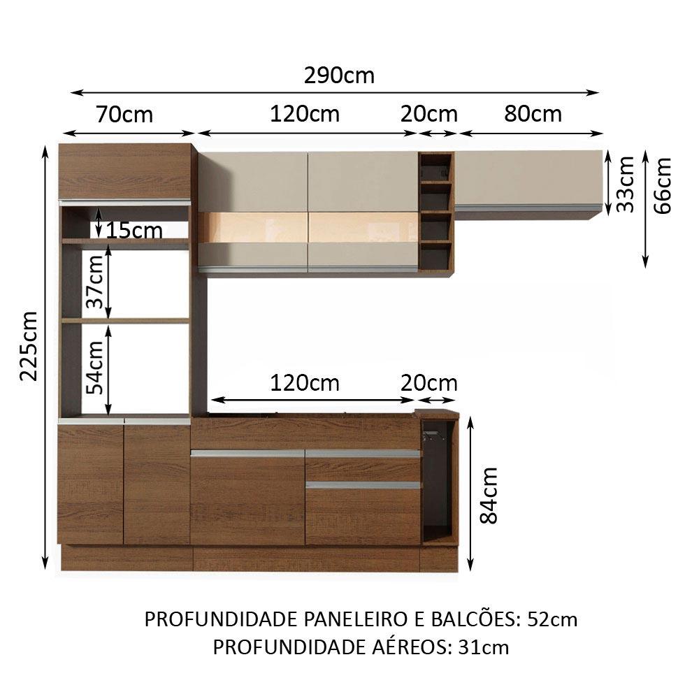 A Cozinha Vicenza Glamy é a campeã de vendas da Madesa. Uma cozinha completa com design moderno e um ótimo acabamento. Se destaca por parecer uma cozinha planejada com ótimo aproveitamento dos espaços internos.As gavetas possuem corrediças telescópicas e todas as portas possuem amortecedor para o fechamento suave. Esses itens de qualidade superior conferem durabilidade e maior vida útil do móvel.Outro grande diferencial desta cozinha é a profundidade maior, como uma cozinha planejada: 52 cm no balcão inferior e 31 cm nos aéreos. As medidas totais são: 290 cm de largura e 225 cm de altura.O balcão maior comporta pias de 120 cm x 52 cm e acompanha tampo em MDP no padrão amadeirado Rustic. Já o balcão menor segue com tampo de 80 cm x 52 cm que pode ser recortado para a colocação do cooktop. Todos os módulos inferiores possuem também pés reguláveis e rodapé removível. A torre possui espaço para forno e micro-ondas e permite a instalação de forno embutido.O acabamento da cozinha é no padrão amadeirado Rustic. As portas dos aéreos são em pintura Crema e as partes internas das gavetas e das costas são brancas. O processo é feito em Pintura Poliéster ecológica de alta resistência, que aumenta a qualidade e durabilidade do produto.Esta cozinha pode ser complementada pelos módulos avulsos da linha Glamy da Madesa.(Imagens meramente ilustrativas: a decoração não acompanha o produto.)Itens inclusos:- Uma (1) torre-quente com dois (2) nichos para forno e micro-ondas e três (3) portas sendo uma (1) basculante- Um (1) balcão de pia com duas (2) gavetas e uma (1) porta e tampo em MDP- Um (1) porta panos- Um (1) aéreo com duas (2) portas com detalhe em vidro reflex- Um (1) aéreo com uma (1) porta basculante- Uma (1) adegaCódigo do produto: GRGL2900139YObs.: A Madesa não disponibiliza serviço de montagem. O produto segue com manual de instalação e todas as ferragens necessárias para sua montagem.1-O produto é novo ou usado?R.: Todos os produtos da Madesa são novos, enviados da nossa fábrica diretamente para as casas de nossos clientes.2-O produto vem montado? Se não, vocês realizam a montagem?R.: A Madesa não disponibiliza serviço de montagem. Todos os produtos seguem com manual de instalação e as ferragens necessárias. Alguns produtos possuem vídeo explicando o passo a passo da montagem.3-Vocês possuem loja física? Posso retirar meu produto em mãos?R.: Não possuímos loja física, apenas loja virtual. Confira as opções de envio ao colocar o seu CEP.4-Qual é o valor do envio? Posso pagar separadamente?R.: O valor do envio é calculado com base no peso e volume do produto, e no CEP de destino. Você pode calcular o valor e prazo de entrega no simulador.5-A Madesa entrega em todo Brasil? Como é feita a entrega?R.: Sim, entregamos no Brasil inteiro através de transportadoras parceiras.6-O produto acompanha Nota Fiscal?R.: Sim, todos os produtos são entregues com suas respectivas notas fiscais.7-Os produtos possuem garantia?R.: Sim. A Madesa oferece 3 meses de garantia para defeitos de fabricação.A Madesa se dedica à sustentabilidade com várias iniciativas: temos uma usina própria para gerar energia que abastece uma de nossas fábricas. Selecionamos nossos fornecedores, priorizando aqueles que possuem um compromisso com a sustentabilidade e proteção do meio ambiente. Todo o plástico utilizado no setor produtivo é proveniente de reciclagem e as suas sobras são encaminhadas ao fornecedor que os recicla. Também investimos no desenvolvimento contínuo de nossos colaboradores e em ações educacionais que beneficiem a comunidade.