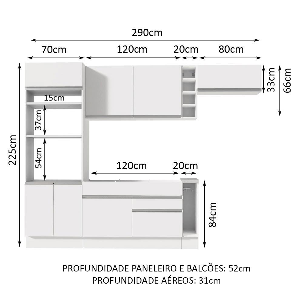 A Cozinha Safira da linha Glamy é uma das campeãs de vendas da Madesa. Se destaca por parecer uma cozinha planejada com ótimo aproveitamento dos espaços internos. As gavetas possuem corrediças telescópicas e todas as portas possuem dobradiças com amortecimento para o fechamento suave.Outro grande diferencial desta cozinha é a profundidade maior, como uma cozinha planejada: 52 cm no balcão inferior e 31 cm nos aéreos. As medidas totais são: 290 cm de largura e 225 cm de altura.O balcão comporta pias de 120 cm x 52 cm e acompanha tampo de MDP em pintura Mood. Todos os módulos inferiores possuem também pés reguláveis e o rodapé é removível, para facilitar a limpeza. A torre possui espaço para forno e micro-ondas e permite a instalação de forno embutido.O acabamento da cozinha é branco, feito em Pintura Poliéster ecológica de alta resistência, que protege o móvel dos efeitos da água, do álcool e do calor.Esta cozinha pode ser complementada pelos módulos avulsos da linha Glamy da Madesa.(Imagens meramente ilustrativas: a decoração não acompanham o produto.)Itens inclusos:- Uma (1) torre-quente com dois (2) nichos para forno e micro-ondas, um (1) nicho menor e três (3) portas sendo uma (1) basculante- Um (1) balcão de pia com duas (2) gavetas e uma (1) porta e tampo em MDP- Um (1) balcão porta panos com tampo em MDP- Um (1) aéreo com duas (2) portas- Uma (1) mini adega- Um (1) aéreo com uma (1) porta basculanteCódigo do produto: GRGL29001409Obs.: A Madesa não disponibiliza serviço de montagem. O produto segue com manual de instalação e todas as ferragens necessárias para sua montagem.1-O produto é novo ou usado?R.: Todos os produtos da Madesa são novos, enviados da nossa fábrica diretamente para as casas de nossos clientes.2-O produto vem montado? Se não, vocês realizam a montagem?R.: A Madesa não disponibiliza serviço de montagem. Todos os produtos seguem com manual de instalação e as ferragens necessárias. Alguns produtos possuem vídeo explicando o passo a passo da montagem.3-Vocês possuem loja física? Posso retirar meu produto em mãos?R.: Não possuímos loja física, apenas loja virtual. Confira as opções de envio ao colocar o seu CEP.4-Qual é o valor do envio? Posso pagar separadamente?R.: O valor do envio é calculado com base no peso e volume do produto, e no CEP de destino. Você pode calcular o valor e prazo de entrega no simulador.5-A Madesa entrega em todo Brasil? Como é feita a entrega?R.: Sim, entregamos no Brasil inteiro através de transportadoras parceiras.6-O produto acompanha Nota Fiscal?R.: Sim, todos os produtos são entregues com suas respectivas notas fiscais.7-Os produtos possuem garantia?R.: Sim. A Madesa oferece 3 meses de garantia para defeitos de fabricação.A Madesa se dedica à sustentabilidade com várias iniciativas: temos uma usina própria para gerar energia que abastece uma de nossas fábricas. Selecionamos nossos fornecedores, priorizando aqueles que possuem um compromisso com a sustentabilidade e proteção do meio ambiente. Todo o plástico utilizado no setor produtivo é proveniente de reciclagem e as suas sobras são encaminhadas ao fornecedor que os recicla. Também investimos no desenvolvimento contínuo de nossos colaboradores e em ações educacionais que beneficiem a comunidade.