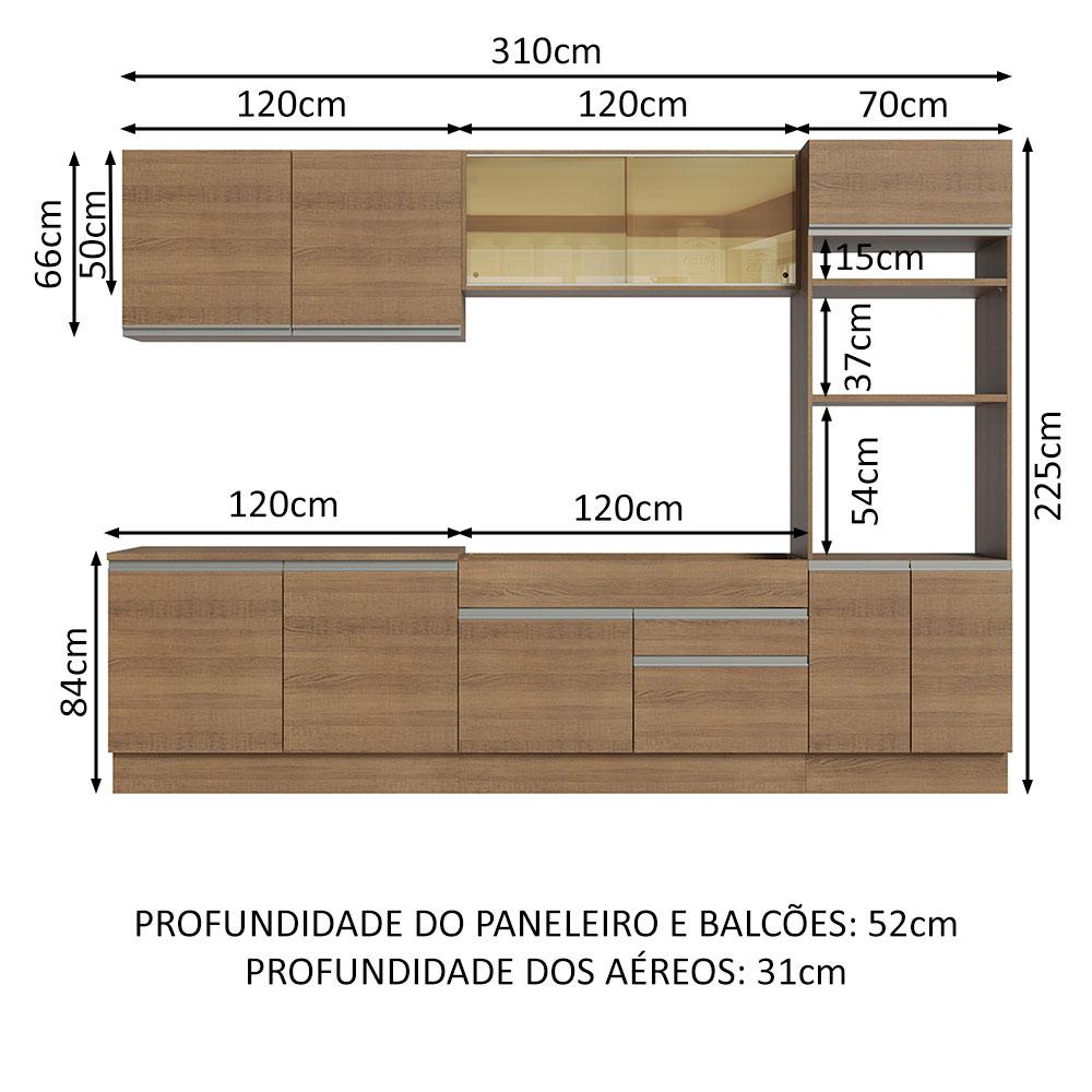 Todo mundo adora se reunir na cozinha com a família e com os amigos, certo? Esta Cozinha Completa da linha Glamy da Madesa tornará esses encontros ainda mais especiais.A fabricação é feita com itens de muita qualidade, como vidros reflex, puxadores em alumínio, gavetas com corrediças telescópicas, portas com amortecimento e pistão a gás para a porta basculante.Composta por vários módulos separados, possui ótimo espaço disponível. Assim, você terá muito espaço para organizar todos os seus utensílios, pratos e mantimentos, deixando seu ambiente mais funcional e prático.A cozinha é totalmente modulada, podendo ser personalizada para se adequar ao seu ambiente. Com isso, se torna uma cozinha planejada.O balcão de pia possibilita a colocação de pias de inox ou pedra, no tamanho de 120 cm x 52 cm.Para completar, a cozinha conta com pés reguláveis em PVC e rodapé removível em MDP de fácil encaixe, para retirar na hora de realizar a limpeza.O acabamento da cozinha é em amadeirado Rustic, feito em Pintura Poliéster com 7 camadas que protegem o móvel dos efeitos do álcool da água e do calor.Medidas totais:- 225 cm de altura- 310 cm de largura- 52 cm nos módulos inferiores e 31 cm nos aéreosItens inclusos:- Um (1) Aéreo de 120 cm com duas (2) portas- Um (1) Balcão de 120 cm com duas (2) portas e tampo- Um (1) Aéreo de 120 cm com duas (2) portas de correr de vidro reflex e um (1) nicho- Um (1) Balcão de 120 cm com uma (1) porta e duas (2) gavetas (Não acompanha tampo para este balcão.)- Uma (1) Torre Quente de 70 cm com três (3) portas e (3) nichosCódigo do produto: GRGL3100015ZObs.:- Imagens meramente ilustrativas, os eletros, o tampo da pia, a torneira e a decoração não acompanham o produto- Por segurança, é necessário fixar a torre na parede- A Madesa não disponibiliza serviço de montagem- O produto segue com manual e todas as ferragens necessárias para a instalação1 – O produto é novo ou usado?R.: Todos os produtos da Madesa são novos, enviados da nossa fábrica diretamente para as casas de nossos clientes.2 – O produto vem montado? Se não, vocês realizam a montagem?R.: A Madesa não disponibiliza serviço de montagem. Todos os produtos seguem com manual de instalação e as ferragens necessárias. Alguns produtos possuem vídeo explicando o passo a passo da montagem.3 – Vocês possuem loja física? Posso retirar meu produto em mãos?R.: Não possuímos loja física, apenas loja virtual. Confira as opções de envio ao colocar o seu CEP.4 – Qual é o valor do envio? Posso pagar separadamente?R.: O valor do envio é calculado com base no peso e volume do produto, e no CEP de destino. Você pode calcular o valor e prazo de entrega no simulador.5 – A Madesa entrega em todo Brasil? Como é feita a entrega?R.: Sim, entregamos no Brasil inteiro através de transportadoras parceiras.6 – O produto acompanha Nota Fiscal?R.: Sim, todos os produtos são entregues com suas respectivas notas fiscais.A Madesa se dedica à sustentabilidade com várias iniciativas: temos uma usina própria para gerar energia que abastece uma de nossas fábricas. Selecionamos nossos fornecedores, priorizando aqueles que possuem um compromisso com a sustentabilidade e proteção do meio ambiente. Todo o plástico utilizado no setor produtivo é proveniente de reciclagem e as suas sobras são encaminhadas ao fornecedor que os recicla. Também investimos no desenvolvimento contínuo de nossos colaboradores e em ações educacionais que beneficiem a comunidade.