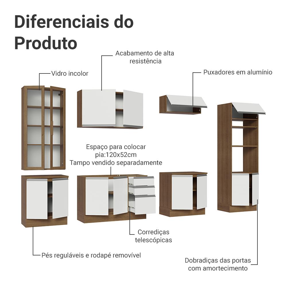 O Armário de Cozinha Completa Glamy combina funcionalidade e estilo moderno.O móvel é equipado com puxadores em alumínio e gavetas com corrediças telescópicas, que abrem totalmente. Já as portas possuem amortecimento, proporcionando um fechamento suave, enquanto os pés em PVC contam com regulagem de altura.O grande destaque fica por conta da cristaleira, que traz um toque refinado ao ambiente. Com duas portas de vidro, oferece um espaço amplo e organizado, ideal para expor suas louças.Formada por módulos avulsos, a cozinha se adapta perfeitamente às necessidades do seu ambiente.Para completar, o móvel possui acabamento de alta resistência que combina os tons amadeirado Rustic e branco.Medidas totais:- 225 cm de altura- 340 cm de largura- 52 cm de profundidade nos balcões e na torre e 31 cm nos aéreosO que você recebe:- Uma Cristaleira de 70 cm com duas portas- Um Balcão de 70 cm com duas portas e tampo- Um Aéreo de 120 cm com duas portas- Um Balcão de 120 cm com duas portas e três gavetas (Não possui tampo.)- Um Aéreo de 80 cm com uma porta basculante- Um Balcão de 80 cm com duas portas e tampo- Uma Torre de 70 cm com três portas e dois nichos para fornos- Manual de montagem e ferragens necessáriasCódigo do produto: GRGL3400016EÉ bom saber:- A cristaleira não acompanha pés nem kit para suspender na parede. Deve ser instalada sobre o balcão e fixada na parede.- As imagens são meramente ilustrativas, os eletros e a decoração não acompanham o produto- A Madesa não oferece serviço de montagemA Madesa se dedica à sustentabilidade com várias iniciativas: temos uma usina própria para gerar energia que abastece uma de nossas fábricas. Selecionamos nossos fornecedores, priorizando aqueles que possuem um compromisso com a sustentabilidade e proteção do meio ambiente. Todo o plástico utilizado no setor produtivo é proveniente de reciclagem e as suas sobras são encaminhadas ao fornecedor que os recicla. Também investimos no desenvolvimento contínuo de nossos colaboradores.
