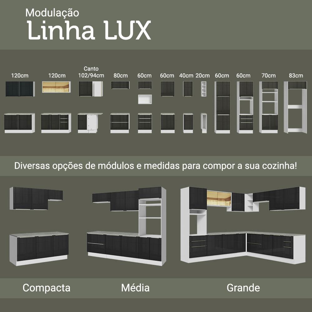 Pensou em sofisticação e elegância? Não deixe de conferir a linha de cozinhas Lux da Madesa!O grande destaque são as portas e gavetas, que recebem um vidro preto aplicado, detalhe que traz muita elegância ao ambiente.Todos os puxadores são em alumínio, mais resistentes ao uso diário e os pés dos balcões são reguláveis em PVC, com rodapé removível para facilitar na hora de fazer a limpeza.Com ótimo espaço interno, possui profundidade de cozinha planejada: 60 cm. Além disso, é fabricada com itens de qualidade superior, como corrediças telescópicas, dobradiças metálicas e amortecedores para o fechamento suave das portas.O balcão comporta pias de inox ou pedra no tamanho de 120 cm x 60 cm e não acompanha tampo. Já a torre possui espaço para forno ou micro-ondas e permite a instalação de forno embutido.O acabamento da estrutura é branco e as portas e as frentes das gavetas são pretas. É feito em Pintura Poliéster com aplicação de 7 camadas de proteção resistentes a álcool, água e calor.Medidas totais da cozinha:- 225 cm de altura- 180 cm de largura- 60 cm de profundidade nos módulos inferiores e 31 cm nos aéreosItens inclusos:- Uma (1) Torre-Quente com uma (1) porta, três (3) gavetas e dois (2) nichos- Um (1) Aéreo de 120 cm com duas (2) portas- Um (1) Balcão de pia de 120 cm com duas (2) portas (Não acompanha tampo para este balcão)Código do produto: GRLX18000173Obs.:- Imagens meramente ilustrativas- Os eletros, o tampo da pia, a torneira e a decoração não acompanham o produto- A Madesa não disponibiliza serviço de montagem- O produto segue com manual de instalação e todas as ferragens necessárias para sua montagem1 – O produto é novo ou usado?R.: Todos os produtos da Madesa são novos, enviados da nossa fábrica diretamente para as casas de nossos clientes.2 – O produto vem montado? Se não, vocês realizam a montagem?R.: A Madesa não disponibiliza serviço de montagem. Todos os produtos seguem com manual de instalação e as ferragens necessárias. Alguns produtos possuem vídeo explicando o passo a passo da montagem.3 – Vocês possuem loja física? Posso retirar meu produto em mãos?R.: Não possuímos loja física, apenas loja virtual. Confira as opções de envio ao colocar o seu CEP.4 – Qual é o valor do envio? Posso pagar separadamente?R.: O valor do envio é calculado com base no peso e volume do produto, e no CEP de destino. Você pode calcular o valor e prazo de entrega no simulador.5 – A Madesa entrega em todo Brasil? Como é feita a entrega?R.: Sim, entregamos no Brasil inteiro através de transportadoras parceiras.6 – O produto acompanha Nota Fiscal?R.: Sim, todos os produtos são entregues com suas respectivas notas fiscais.7 – Os produtos possuem garantia?R.: Sim. A Madesa oferece 3 meses de garantia para defeitos de fabricação.A Madesa se dedica à sustentabilidade com várias iniciativas: temos uma usina própria para gerar energia que abastece uma de nossas fábricas. Selecionamos nossos fornecedores, priorizando aqueles que possuem um compromisso com a sustentabilidade e proteção do meio ambiente. Todo o plástico utilizado no setor produtivo é proveniente de reciclagem e as suas sobras são encaminhadas ao fornecedor que os recicla. Também investimos no desenvolvimento contínuo de nossos colaboradores e em ações educacionais que beneficiem a comunidade.
