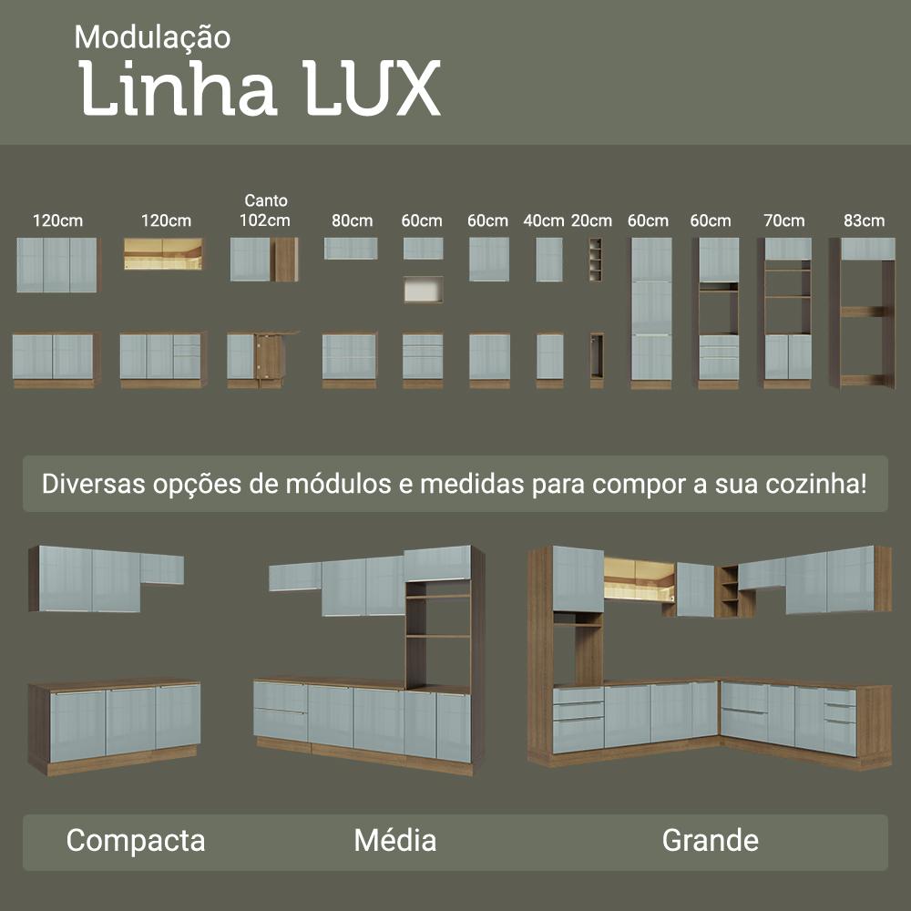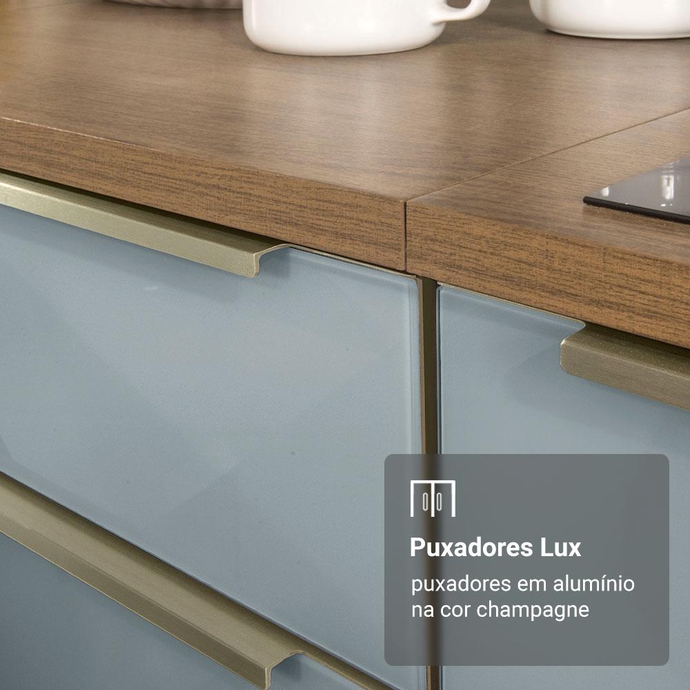 O Armário de Cozinha Compacta da linha Lux da Madesa é a união perfeita entre modernidade e sofisticação.Um dos grandes diferenciais deste modelo é a cristaleira. Super sofisticada, possui duas portas de vidro e muito espaço disponível para organizar louças, copos e demais objetos.Fabricada com alto padrão de qualidade, a cozinha conta com vidro incolor sobreposto nas frentes e portas, puxadores em alumínio, gavetas com corrediças telescópicas de abertura total, portas com amortecimento para fechamento suave e pés reguláveis em PVC.A disposição interna é ótima, com diversas gavetas, prateleiras e nichos. Assim, fica mais fácil fazer a organização de todos os utensílios. Além disso, o balcão acompanha tampo, que pode ser removido para instalação de pia de inox ou pedra, nas medidas de 120 x 60 cm.Esta cozinha é planejada, composta por módulos avulsos que podem ser organizados conforme o espaço do seu ambiente. Também pode ser posteriormente complementada pelos módulos da linha Lux da Madesa.E para completar, o acabamento da estrutura é em amadeirado Rustic e o das portas e frentes é cinza.Medidas totais:- 225 cm de altura- 190 cm de largura- 60 cm de profundidade nos balcões e 31 cm no aéreo e na cristaleiraItens inclusos:- Uma (1) Cristaleira de 70 cm com duas (2) portas- Um (1) Balcão de 70 cm com duas (2) portas e tampo- Um (1) Aéreo de 120 cm com duas (2) portas- Um (1) Balcão de 120 cm com duas (2) portas, três (3) gavetas e tampoCódigo do produto: GRLX1900029NObs.:- A cristaleira não acompanha pés nem kit para suspender na parede. Deve ser instalada sobre o balcão e fixada na parede.- As imagens são meramente ilustrativas, os eletros e a decoração não acompanham o produto