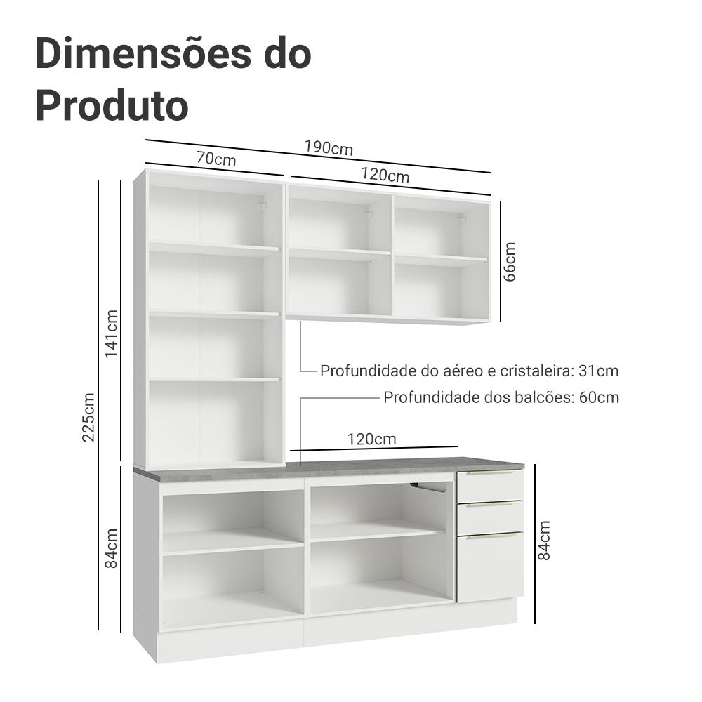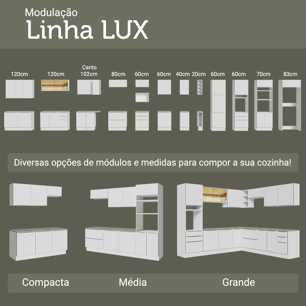 O Armário de Cozinha Compacta da linha Lux da Madesa é a união perfeita entre modernidade e sofisticação.Um dos grandes diferenciais deste modelo é a cristaleira. Super sofisticada, possui duas portas de vidro e muito espaço disponível para organizar louças, copos e demais objetos.Fabricada com alto padrão de qualidade, a cozinha conta com puxadores em alumínio, gavetas com corrediças telescópicas de abertura total, portas com amortecimento para fechamento suave e pés reguláveis em PVC.A disposição interna é ótima, com diversas gavetas, prateleiras e nichos. Assim, fica mais fácil fazer a organização de todos os utensílios. Além disso, o balcão acompanha tampo, que pode ser removido para instalação de pia de inox ou pedra, nas medidas de 120 x 60 cm.Esta cozinha é planejada, composta por módulos avulsos que podem ser organizados conforme o espaço do seu ambiente. Também pode ser posteriormente complementada pelos módulos da linha Lux da Madesa.E para completar, o acabamento da estrutura é branco e o das portas e frentes é na coloração branco veludo.Medidas totais:- 225 cm de altura- 190 cm de largura- 60 cm de profundidade nos balcões e 31 cm no aéreo e na cristaleiraItens inclusos:- Uma (1) Cristaleira de 70 cm com duas (2) portas- Um (1) Balcão de 70 cm com duas (2) portas e tampo- Um (1) Aéreo de 120 cm com duas (2) portas- Um (1) Balcão de 120 cm com duas (2) portas, três (3) gavetas e tampoCódigo do produto: GRLX190002H7Obs.:- A cristaleira não acompanha pés nem kit para suspender na parede. Deve ser instalada sobre o balcão e fixada na parede.- As imagens são meramente ilustrativas, os eletros e a decoração não acompanham o produto