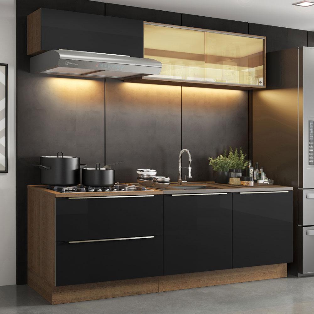 A linha de cozinhas Lux da Madesa é o que existe de mais sofisticado no mercado. O grande destaque são as portas e gavetas que recebem um vidro preto aplicado, detalhe que traz muita elegância ao ambiente.O espaço interno é ótimo, com profundidade de cozinha planejada: 60 cm. Além disso, é fabricada com itens de qualidade superior, como corrediças telescópicas, dobradiças metálicas e amortecedores para o fechamento suave das portas.Outro diferencial de destaque é o aéreo maior, que conta com duas portas de correr de vidro reflex, podendo refletir o espaço ou mostrar o interior do móvel, variando conforme a luz do ambiente.Já o balcão de 80 cm possui duas gavetas grandes e acompanha tampo em MDP que pode ser recortado para colocação de cooktop. Para completar, todos os puxadores são em alumínio, mais resistentes ao uso diário e os pés dos balcões são reguláveis em PVC, com rodapé removível para facilitar na hora de fazer a limpeza.As medidas totais da cozinha são: 200 cm de largura x 225 cm de altura. A profundidade é de 60 cm nos módulos inferiores e 31 cm nos aéreos. O balcão de pia comporta pias de 120 cm x 60 cm. Não acompanha tampo.O acabamento interno e externo é no padrão amadeirado Rustic. As portas e as frentes das gavetas possuem pintura preta. As partes internas das costas e das gavetas são brancas. A Pintura em Poliéster Protetor consiste na aplicação de 7 camadas de proteção resistentes a álcool, água e calor.(A imagem é meramente ilustrativa. Os eletros, o tampo da pia, a torneira e a decoração não acompanham o produto.)Itens inclusos:- Um (1) Aéreo de 80 cm com uma (1) porta basculante- Um (1) Balcão de 80 cm de largura com duas (2) gavetas e tampo em MDP com pintura no padrão amadeirado Rustic- Um (1) Aéreo de 120 cm com duas (2) portas de correr de vidro reflex- Um (1) Balcão de pia de 120 cm com duas (2) portas (não acompanha tampo para este balcão)Código do produto: GRLX2000017KObs.: A Madesa não disponibiliza serviço de montagem. O produto segue com manual de instalação e todas as ferragens necessárias para sua montagem.1 – O produto é novo ou usado?R.: Todos os produtos da Madesa são novos, enviados da nossa fábrica diretamente para as casas de nossos clientes.2 – O produto vem montado? Se não, vocês realizam a montagem?R.: A Madesa não disponibiliza serviço de montagem. Todos os produtos seguem com manual de instalação e as ferragens necessárias. Alguns produtos possuem vídeo explicando o passo a passo da montagem.3 – Vocês possuem loja física? Posso retirar meu produto em mãos?R.: Não possuímos loja física, apenas loja virtual. Confira as opções de envio ao colocar o seu CEP.4 – Qual é o valor do envio? Posso pagar separadamente?R.: O valor do envio é calculado com base no peso e volume do produto, e no CEP de destino. Você pode calcular o valor e prazo de entrega no simulador.5 – A Madesa entrega em todo Brasil? Como é feita a entrega?R.: Sim, entregamos no Brasil inteiro através de transportadoras parceiras.6 – O produto acompanha Nota Fiscal?R.: Sim, todos os produtos são entregues com suas respectivas notas fiscais.7 – Os produtos possuem garantia?R.: Sim. A Madesa oferece 3 meses de garantia para defeitos de fabricação.A Madesa se dedica à sustentabilidade com várias iniciativas: temos uma usina própria para gerar energia que abastece uma de nossas fábricas. Selecionamos nossos fornecedores, priorizando aqueles que possuem um compromisso com a sustentabilidade e proteção do meio ambiente. Todo o plástico utilizado no setor produtivo é proveniente de reciclagem e as suas sobras são encaminhadas ao fornecedor que os recicla. Também investimos no desenvolvimento contínuo de nossos colaboradores e em ações educacionais que beneficiem a comunidade.