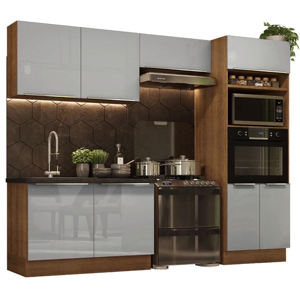 A Lux é uma linha de cozinhas de qualidade superior, focada na sofisticação. O grande destaque são as portas, que recebem um vidro cinza aplicado, detalhe que traz muita elegância ao ambiente. Além disso, possuem amortecedor para o fechamento suave e puxadores em alumínio.Internamente, o espaço é ótimo e você pode organizar toda a parte de louças, mantimentos e utensílios da sua cozinha. A torre possui espaço para forno e micro-ondas, podendo ser normal ou embutido.Outro grande diferencial desta cozinha é a profundidade maior, como uma cozinha planejada: 60 cm na torre e no balcão. Nos aéreos, a profundidade é de 31 cm.As medidas totais da cozinha são: 270 cm de largura e 225 cm de altura. O balcão comporta pias de pedra ou inox, no tamanho de 120 cm x 60 cm e não acompanha tampo.O acabamento interno e externo é no padrão amadeirado Rustic e as portas possuem pintura cinza. As partes internas das costas e das gavetas são brancas. A Pintura em Poliéster Protetor consiste na aplicação de 7 camadas de proteção resistentes a álcool, água e calor.(As imagens são meramente ilustrativas. Os eletros, o tampo da pia, a torneira e a decoração não acompanham o produto.)Itens inclusos:- Um (1) Aéreo de 120 cm com duas (2) portas- Um (1) Balcão de pia de 120 cm com duas (2) portas (não acompanha tampo para este balcão)- Um (1) Aéreo de 80 cm com uma (1) porta basculante- Uma (1) Torre quente de 70 cm com três (3) portas, dois (2) nichos para forno e um (1) nicho menorCódigo do produto: GRLX2700019NObs.: A Madesa não disponibiliza serviço de montagem. O produto segue com manual de instalação e todas as ferragens necessárias para sua montagem.1 – O produto é novo ou usado?R.: Todos os produtos da Madesa são novos, enviados da nossa fábrica diretamente para as casas de nossos clientes.2 – O produto vem montado? Se não, vocês realizam a montagem?R.: A Madesa não disponibiliza serviço de montagem. Todos os produtos seguem com manual de instalação e as ferragens necessárias. Alguns produtos possuem vídeo explicando o passo a passo da montagem.3 – Vocês possuem loja física? Posso retirar meu produto em mãos?R.: Não possuímos loja física, apenas loja virtual. Confira as opções de envio ao colocar o seu CEP.4 – Qual é o valor do envio? Posso pagar separadamente?R.: O valor do envio é calculado com base no peso e volume do produto, e no CEP de destino. Você pode calcular o valor e prazo de entrega no simulador.5 – A Madesa entrega em todo Brasil? Como é feita a entrega?R.: Sim, entregamos no Brasil inteiro através de transportadoras parceiras.6 – O produto acompanha Nota Fiscal?R.: Sim, todos os produtos são entregues com suas respectivas notas fiscais.7 – Os produtos possuem garantia?R.: Sim. A Madesa oferece 3 meses de garantia para defeitos de fabricação.A Madesa se dedica à sustentabilidade com várias iniciativas: temos uma usina própria para gerar energia que abastece uma de nossas fábricas. Selecionamos nossos fornecedores, priorizando aqueles que possuem um compromisso com a sustentabilidade e proteção do meio ambiente. Todo o plástico utilizado no setor produtivo é proveniente de reciclagem e as suas sobras são encaminhadas ao fornecedor que os recicla. Também investimos no desenvolvimento contínuo de nossos colaboradores e em ações educacionais que beneficiem a comunidade.