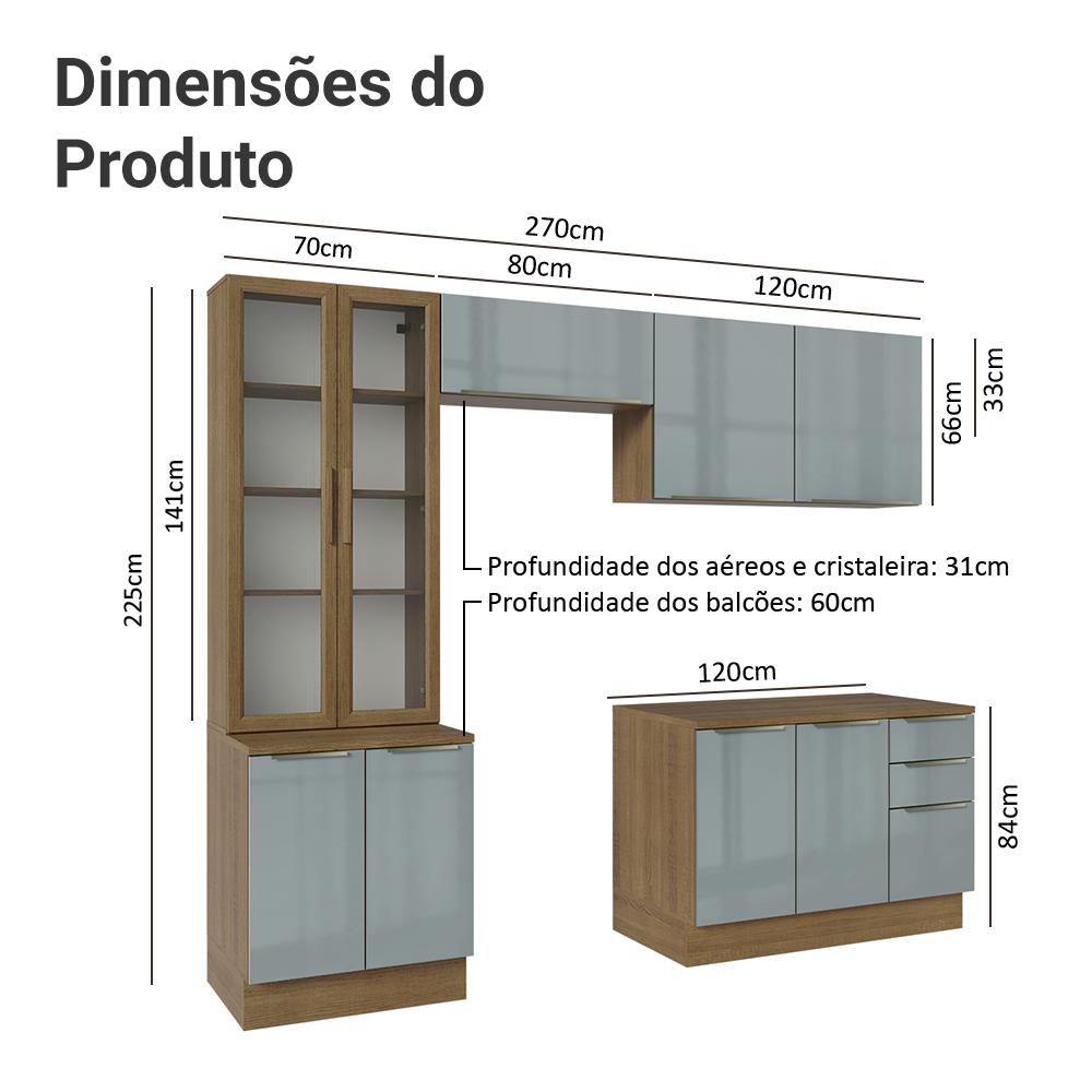 A Cozinha Completa Lux da Madesa é sinônimo de modernidade e elegância.Um dos grandes diferenciais desta versão é a cristaleira, que deixa o ambiente muito mais sofisticado. Com duas portas de vidro, oferece espaço amplo para exibir louças e objetos decorativos.Fabricada com alto padrão de qualidade, a cozinha conta com vidro incolor sobreposto nas frentes e portas, puxadores em alumínio, gavetas com corrediças telescópicas de abertura total, portas com amortecimento para fechamento suave.A disposição interna é ótima, com diversas gavetas, prateleiras e nichos. Além disso, o balcão acompanha tampo, que pode ser removido para instalação de pia de inox ou pedra, nas medidas de 120 x 60 cm.Composta por módulos avulsos, esta cozinha pode ser organizada conforme a necessidade do seu ambiente.Medidas totais:- 225 cm de altura- 270 cm de largura- 60 cm de profundidade nos balcões e 31 cm nos aéreosO que você recebe:- Uma Cristaleira de 70 cm com duas portas- Um Balcão de 70 cm com duas portas e tampo- Um Aéreo de 120 cm com duas portas- Um Balcão de 120 cm com duas portas, três gavetas e tampo- Um Aéreo de 80 cm com uma porta basculanteCódigo do produto: GRLX2700049RÉ bom saber:- A cristaleira não acompanha pés nem kit para suspender na parede. Deve ser instalada sobre o balcão e fixada na parede.- As imagens são meramente ilustrativas, os eletros e a decoração não acompanham o produto- A Madesa não oferece serviço de montagemA Madesa se dedica à sustentabilidade com várias iniciativas: temos uma usina própria para gerar energia que abastece uma de nossas fábricas. Selecionamos nossos fornecedores, priorizando aqueles que possuem um compromisso com a sustentabilidade e proteção do meio ambiente. Todo o plástico utilizado no setor produtivo é proveniente de reciclagem e as suas sobras são encaminhadas ao fornecedor que os recicla. Também investimos no desenvolvimento contínuo de nossos colaboradores e em ações educacionais que beneficiem a comunidade.