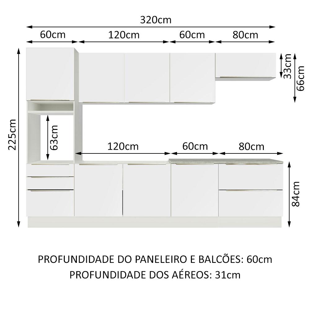 Beleza e sofisticação definem perfeitamente a linha de cozinhas Lux da Madesa.Fabricada com itens de qualidade superior, possui gavetas com corrediças telescópicas, portas com amortecedores para o fechamento suave e puxadores em alumínio, mais resistentes ao uso diário.Um dos principais diferenciais desta versão são as portas e frentes das gavetas, que possuem revestimento metálico nas bordas e acabamento em Branco Veludo, uma pintura especial e sofisticada, com toque liso e aveludado.A profundidade é de cozinha planejada: 60 cm. O balcão maior comporta pias de inox ou pedra no tamanho de 120 cm x 60 cm. Já o tampo do balcão de 80 cm pode ser recortado para instalação de cooktop.Para oferecer ainda mais espaço, a torre tem espaço para forno ou micro-ondas e permite a instalação de forno embutido.Os pés são reguláveis em PVC, com rodapé removível em MDP para facilitar na hora de fazer a limpeza.Medidas totais da cozinha:- 225 cm de altura- 320 cm de largura- 60 cm de profundidade no paneleiro, na torre e nos balcões e 31 cm nos aéreosO acabamento da estrutura é branco e as portas e frentes das gavetas são em Branco Veludo. É feito em Pintura Poliéster, que consiste na aplicação de 7 camadas que protegem o móvel dos efeitos do álcool da água e do calor.Itens inclusos:- Uma (1) Torre Quente de 60 cm com uma (1) porta, três (3) gavetas, sendo uma maior e dois (2) nichos, sendo um para forno- Um (1) Aéreo de 120 cm com duas (2) portas de correr- Um (1) Balcão de pia de 120 cm com duas (2) portas (Não acompanha tampo para este balcão.)- Um (1) Aéreo de 60 cm com uma (1) porta- Um (1) Balcão de 60 cm de largura com uma (1) porta e tampo- Um (1) Aéreo de 80 cm com uma (1) porta basculante- Um (1) Balcão de 80 cm de largura com duas (2) portas e tampoCódigo do produto: GRLX320004H7Obs.:- Imagens meramente ilustrativas, os eletros, o tampo da pia, a torneira e a decoração não acompanham o produto- É obrigatório fixar a torre quente na parede- A Madesa não disponibiliza serviço de montagem- O produto segue com manual de instalação e todas as ferragens necessárias para sua montagem1 – O produto é novo ou usado?R.: Todos os produtos da Madesa são novos, enviados da nossa fábrica diretamente para as casas de nossos clientes.2 – O produto vem montado? Se não, vocês realizam a montagem?R.: A Madesa não disponibiliza serviço de montagem. Todos os produtos seguem com manual de instalação e as ferragens necessárias. Alguns produtos possuem vídeo explicando o passo a passo da montagem.3 – Vocês possuem loja física? Posso retirar meu produto em mãos?R.: Não possuímos loja física, apenas loja virtual. Confira as opções de envio ao colocar o seu CEP.4 – Qual é o valor do envio? Posso pagar separadamente?R.: O valor do envio é calculado com base no peso e volume do produto, e no CEP de destino. Você pode calcular o valor e prazo de entrega no simulador.5 – A Madesa entrega em todo Brasil? Como é feita a entrega?R.: Sim, entregamos no Brasil inteiro através de transportadoras parceiras.A Madesa se dedica à sustentabilidade com várias iniciativas: temos uma usina própria para gerar energia que abastece uma de nossas fábricas. Selecionamos nossos fornecedores, priorizando aqueles que possuem um compromisso com a sustentabilidade e proteção do meio ambiente. Todo o plástico utilizado no setor produtivo é proveniente de reciclagem e as suas sobras são encaminhadas ao fornecedor que os recicla. Também investimos no desenvolvimento contínuo de nossos colaboradores e em ações educacionais que beneficiem a comunidade.