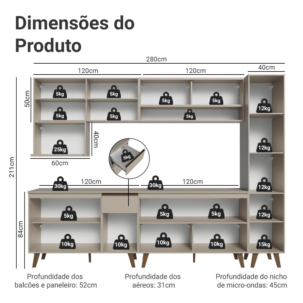 A Cozinha Completa é a solução perfeita para quem busca praticidade e organização. O armário com vidro pontilhado traz um toque de elegância ao ambiente enquanto o módulo aéreo projetado para acomodar fornos ou micro-ondas traz mais funcionalidade.A linha Nice chega em uma nova versão no tom crema, uma tonalidade suave que transmite aconchego e leveza. Outro diferencial está nos puxadores em bronze metalizado e pés em bronze sólido, que acrescentam um toque contemporâneo.Produzido com materiais de qualidade, o balcão conta com dobradiças metálicas nas portas e puxadores em perfil de alumínio, discretos e resistentes. O tampo é removível, o que permite a instalação de cuba ou pedra. O acabamento é de alta resistência, garantindo durabilidade.Medidas totais:- 211 cm de altura- 280 cm de largura- 52 cm de profundidade nos balcões e paneleiro, 31 cm nos aéreos e 45 cm no nicho para micro-ondasO que você recebe:- Um Armário Aéreo de 120 cm com duas portas- Um Nicho aéreo de 60 cm com espaço para forno- Um Armário Aéreo de 120 cm com duas portas em vidro pontilhado- Um Balcão de 120 cm com três portas e uma gaveta - Um Armário Aéreo de 120 cm com duas portas- Um Paneleiro de 40 cm com duas portasCódigo do produto: GRNC2800027PÉ importante saber:- Material: MDP- Imagens meramente ilustrativas, a decoração não acompanha o produto.- A Madesa não oferece serviço de montagem.- O produto segue com manual e todas as ferragens necessárias.- Por segurança, o paneleiro deve ser fixado na parece.A Madesa se dedica à sustentabilidade com várias iniciativas: temos uma usina própria que gera energia para uma das fábricas. Priorizamos fornecedores responsáveis com o meio ambiente. Todo o plástico utilizado na produção é reciclado, e as sobras também são reaproveitadas. Investimos no desenvolvimento de nossos colaboradores e em ações que beneficiem a comunidade.