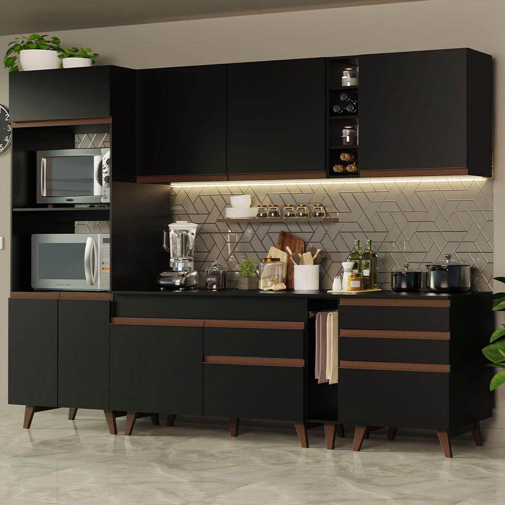 Deixe seu ambiente muito mais bonito e sofisticado com esta linda cozinha modulada da linha Reims da Madesa.Fabricada com materiais de alto padrão, conta com corrediças e dobradiças metálicas e puxadores embutidos em alumínio. Possui ainda pés em madeira maciça, muito seguros e bonitos.É uma cozinha planejada, pois os módulos podem ser dispostos conforme a necessidade do seu ambiente.O espaço disponível é ótimo, ideal para a organização de toda a parte de louça, panelas e utensílios. Além disso, a torre oferece espaço para forno e micro-ondas e permite a instalação de forno embutido.Um diferencial a mais é que todos os balcões acompanham tampos em MDP. O tampo do balcão maior pode ser removido para instalação de pia de inox ou pedra, com espaço de 120 x 52 cm.O acabamento externo é preto, com exceção das partes internas das gavetas e das costas, que são brancas. O processo é feito em Pintura Poliéster ecológica, que protege o móvel dos efeitos da água e do calor.Medidas totais:- 270 cm de largura- 210 cm de altura- 52 cm de profundidade nos balcões e na torre e 31 cm nos aéreosItens inclusos:- Uma (1) Torre-quente de 70 cm com três (3) portas e dois (2) nichos para fornos- Um (1) Armário Aéreo de 120 cm com duas (2) portas- Um (1) Balcão de 120 cm com duas (2) portas e tampo- Uma (1) Adega de 20 cm com quatro (4) nichos- Um (1) Balcão porta-panos de 20 cm com duas (2) hastes metálicas e tampo- Um (1) Armário Aéreo de 60 cm com uma (1) porta- Um (1) Balcão de 60 cm com três (3) gavetas e tampoCódigo do produto: GRRM2700028NObs.:- A Madesa não disponibiliza serviço de montagem- Por segurança, é obrigatório fixar a torre na parede- O produto segue com manual de instalação e todas as ferragens necessárias para sua montagem- Imagens meramente ilustrativas, os eletros e as decorações não acompanham o produto1 – O produto é novo ou usado?R.: Todos os produtos da Madesa são novos, enviados da nossa fábrica diretamente para as casas de nossos clientes.2 – O produto vem montado? Se não, vocês realizam a montagem?R.: A Madesa não disponibiliza serviço de montagem. Todos os produtos seguem com manual de instalação e as ferragens necessárias. Alguns produtos possuem vídeo explicando o passo a passo da montagem.3 – Vocês possuem loja física? Posso retirar meu produto em mãos?R.: Não possuímos loja física, apenas loja virtual. Confira as opções de envio ao colocar o seu CEP.4 – Qual é o valor do envio? Posso pagar separadamente?R.: O valor do envio é calculado com base no peso e volume do produto, e no CEP de destino. Você pode calcular o valor e prazo de entrega no simulador.5 – A Madesa entrega em todo Brasil? Como é feita a entrega?R.: Sim, entregamos no Brasil inteiro através de transportadoras parceiras.6 – O produto acompanha Nota Fiscal?R.: Sim, todos os produtos são entregues com suas respectivas notas fiscais.7 – Os produtos possuem garantia?R.: Sim. A Madesa oferece 3 meses de garantia para defeitos de fabricação.A Madesa se dedica à sustentabilidade com várias iniciativas: temos uma usina própria para gerar energia que abastece uma de nossas fábricas. Selecionamos nossos fornecedores, priorizando aqueles que possuem um compromisso com a sustentabilidade e proteção do meio ambiente. Todo o plástico utilizado no setor produtivo é proveniente de reciclagem e as suas sobras são encaminhadas ao fornecedor que os recicla. Também investimos no desenvolvimento contínuo de nossos colaboradores e em ações educacionais que beneficiem a comunidade.