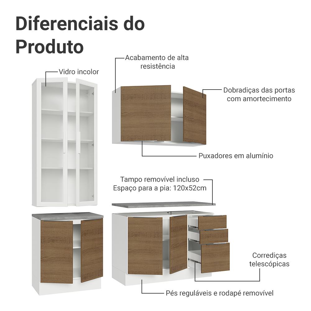 Para renovar sua cozinha com beleza e modernidade, confira este Armário de Cozinha Compacta da linha Stella da Madesa.Composto por itens de muita qualidade, possui puxadores slim em alumínio, gavetas com corrediças telescópicas de abertura total, portas com amortecimento para fechamento suave e pés reguláveis em PVC.O grande diferencial deste modelo fica por conta da cristaleira. Super sofisticada, possui duas portas de vidro e muito espaço disponível para organizar louças, copos e demais objetos.A cozinha ainda conta com diversas gavetas, prateleiras e nichos. Assim, fica mais fácil fazer a organização de todos os utensílios. Além disso, o balcão acompanha tampo, que pode ser removido para instalação de pia de inox ou pedra, nas medidas de 120 x 52 cm.Esta cozinha é planejada, composta por módulos avulsos que podem ser organizados conforme o espaço do seu ambiente. Também pode ser posteriormente complementada pelos módulos da linha Stella da Madesa.E para completar, o acabamento do móvel combina os tons amadeirado Rustic e branco.Medidas totais:- 225 cm de altura- 190 cm de largura- 52 cm de profundidade nos balcões e 31 cm no aéreo e na cristaleiraItens inclusos:- Uma (1) Cristaleira de 70 cm com duas (2) portas- Um (1) Balcão de 70 cm com duas (2) portas e tampo- Um (1) Aéreo de 120 cm com duas (2) portas- Um (1) Balcão de 120 cm com duas (2) portas, três (3) gavetas e tampoCódigo do produto: GRTE1900039BObs.:- A cristaleira não acompanha pés nem kit para suspender na parede. Deve ser instalada sobre o balcão e fixada na parede.- As imagens são meramente ilustrativas, os eletros e a decoração não acompanham o produto