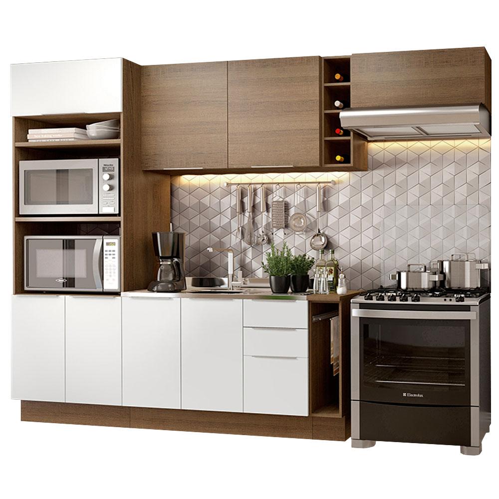 A linha de Cozinhas Stella da Madesa tem como destaque o ótimo acabamento e os materiais com alto padrão de qualidade.As gavetas possuem corrediças telescópicas que permitem abertura total e todas as portas possuem amortecedores para o fechamento suave, evitando o desgaste no uso diário. Além disso, todos os puxadores são em alumínio no formato slim.Tem espaço pra tudo neste modelo: forno, micro-ondas, garrafas, louças, eletros, panos e o que mais você imaginar. É a escolha perfeita para deixar a cozinha muito mais organizada e funcional.Para completar, o balcão comporta pias de 120 cm x 52 cm e todos os módulos inferiores possuem também pés reguláveis em PVC e rodapé removível em MDP de encaixe rápido. Este detalhe facilita muito a limpeza da cozinha.A profundidade é de cozinha planejada: 52 cm nos balcões e na torre e 31 cm nos aéreos. As medidas totais são: 290 cm de largura e 225 cm de altura.O acabamento combina os tons branco e amadeirado Rustic. O processo é feito com a Pintura Poliéster exclusiva da Madesa. Este método não agride o meio ambiente e protege o móvel contra os efeitos da água e do calor.Esta cozinha pode ser complementada por outros módulos avulsos da linha Stella da Madesa(As imagens são meramente ilustrativas. Os eletros, o tampo da pia, a torneira e a decoração não acompanham o produto.)Itens inclusos:- Uma (1) Torre Quente com dois (2) nichos para forno e micro-ondas e três (3) portas sendo uma (1) basculante- Um (1) Balcão de Pia com três (3) gavetas e duas (2) portas (Não acompanha tampo)- Um (1) Balcão porta panos com duas hastes metálicas e tampo Rustic- Um (1) Aéreo com duas (2) portas- Um (1) Aéreo com uma (1) porta basculante- Uma (1) Adega com quatro (4) nichosCódigo do produto: GRTE2900025Z9BObs.: A Madesa não oferece serviço de montagem. O produto segue com as ferragens e manual de instalação com todos os passos para a montagem.1 – O produto é novo ou usado?R.: Todos os produtos da Madesa são novos, enviados da nossa fábrica diretamente para as casas de nossos clientes.2 – O produto vem montado? Se não, vocês realizam a montagem?R.: A Madesa não disponibiliza serviço de montagem. Todos os produtos seguem com manual de instalação e as ferragens necessárias. Alguns produtos possuem vídeo explicando o passo a passo da montagem.3 – Vocês possuem loja física? Posso retirar meu produto em mãos?R.: Não possuímos loja física, apenas loja virtual. Confira as opções de envio ao colocar o seu CEP.4 – Qual é o valor do envio? Posso pagar separadamente?R.: O valor do envio é calculado com base no peso e volume do produto, e no CEP de destino. Você pode calcular o valor e prazo de entrega no simulador.5 – A Madesa entrega em todo Brasil? Como é feita a entrega?R.: Sim, entregamos no Brasil inteiro através de transportadoras parceiras.6 – O produto acompanha Nota Fiscal?R.: Sim, todos os produtos são entregues com suas respectivas notas fiscais.7 – Os produtos possuem garantia?R.: Sim. A Madesa oferece 3 meses de garantia para defeitos de fabricação.A Madesa se dedica à sustentabilidade com várias iniciativas: temos uma usina própria para gerar energia que abastece uma de nossas fábricas. Selecionamos nossos fornecedores, priorizando aqueles que possuem um compromisso com a sustentabilidade e proteção do meio ambiente. Todo o plástico utilizado no setor produtivo é proveniente de reciclagem e as suas sobras são encaminhadas ao fornecedor que os recicla. Também investimos no desenvolvimento contínuo de nossos colaboradores e em ações educacionais que beneficiem a comunidade.
