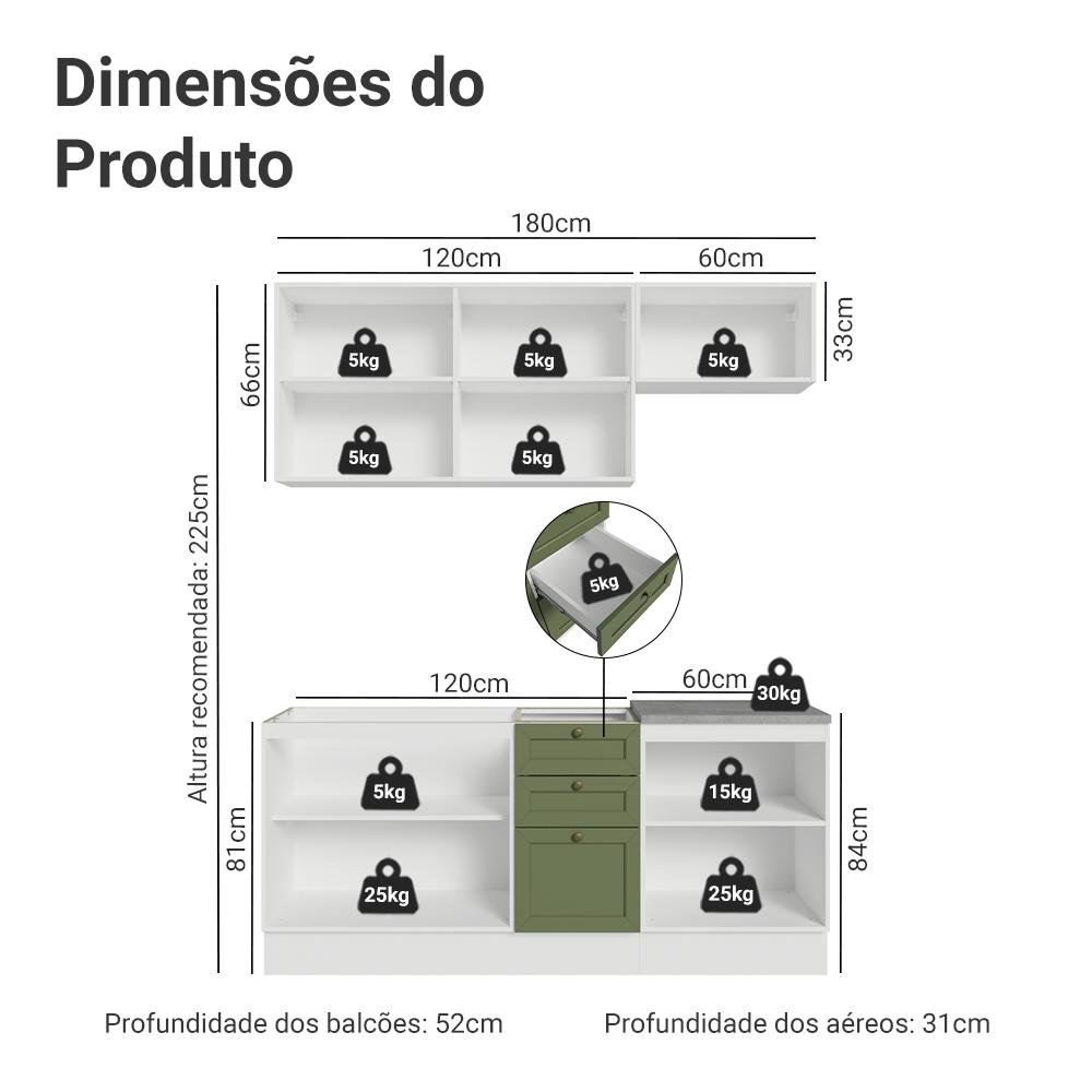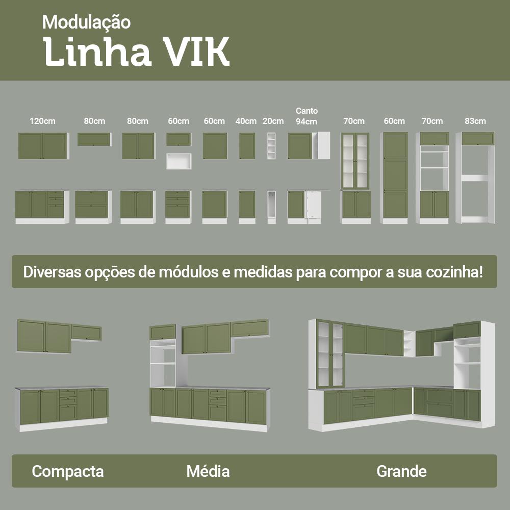 A Cozinha Compacta da Linha Vik é a escolha ideal para quem deseja trazer para sua cozinha o charme do estilo americano. Cada detalhe foi pensado para criar um ambiente acolhedor e elegante.Além disso, a linha Vik é funcional em cada detalhe. As portas possuem dobradiças com amortecimento, garantindo um fechamento suave e silencioso, enquanto as gavetas com corrediças telescópicas permitem abertura total, para você organizar tudo que precisa com muito mais facilidade. O acabamento de alta resistência da estrutura é branco e das frentes em verde, possui uma textura suave ao toque. O destaque fica por conta dos puxadores ponto em ouro envelhecido, feitos com metal resistente, trazem personalidade e um charme único.Os armários e balcões foram cuidadosamente projetados para aproveitar ao máximo o espaço. A cozinha modulada permite que as peças sejam organizadas conforme a necessidade do seu ambiente.O balcão de pia, permite a instalação de pia de inox ou pedra, enquanto o balcão de 60 cm inclui tampo recortável para a instalação de cooktop. Além disso, os aéreos são ideais para manter tudo sempre ao alcance.Medidas totais:Altura: 225 cmLargura: 180 cmProfundidade: 52 cm (módulos inferiores) 31 cm (aéreos)O que você recebe:1 Aéreo de 120 cm com 2 portas1 Balcão de Pia com 2 portas e 3 gavetas (não acompanha tampo)1 Aéreo de 60 cm com 1 porta basculante1 Balcão de 60 cm com 1 porta e tampoCódigo do produto: GRVK180001L9É Importante saber:As imagens são meramente ilustrativas; os eletros e a decoração não acompanham o produtoA Madesa não oferece serviço de montagemProduto acompanha manual e ferragens necessáriasA Madesa se dedica à sustentabilidade: temos uma usina própria que gera energia para uma de nossas fábricas, priorizamos fornecedores responsáveis e reciclamos plásticos na produção. Também investimos no desenvolvimento dos colaboradores e em ações sociais.