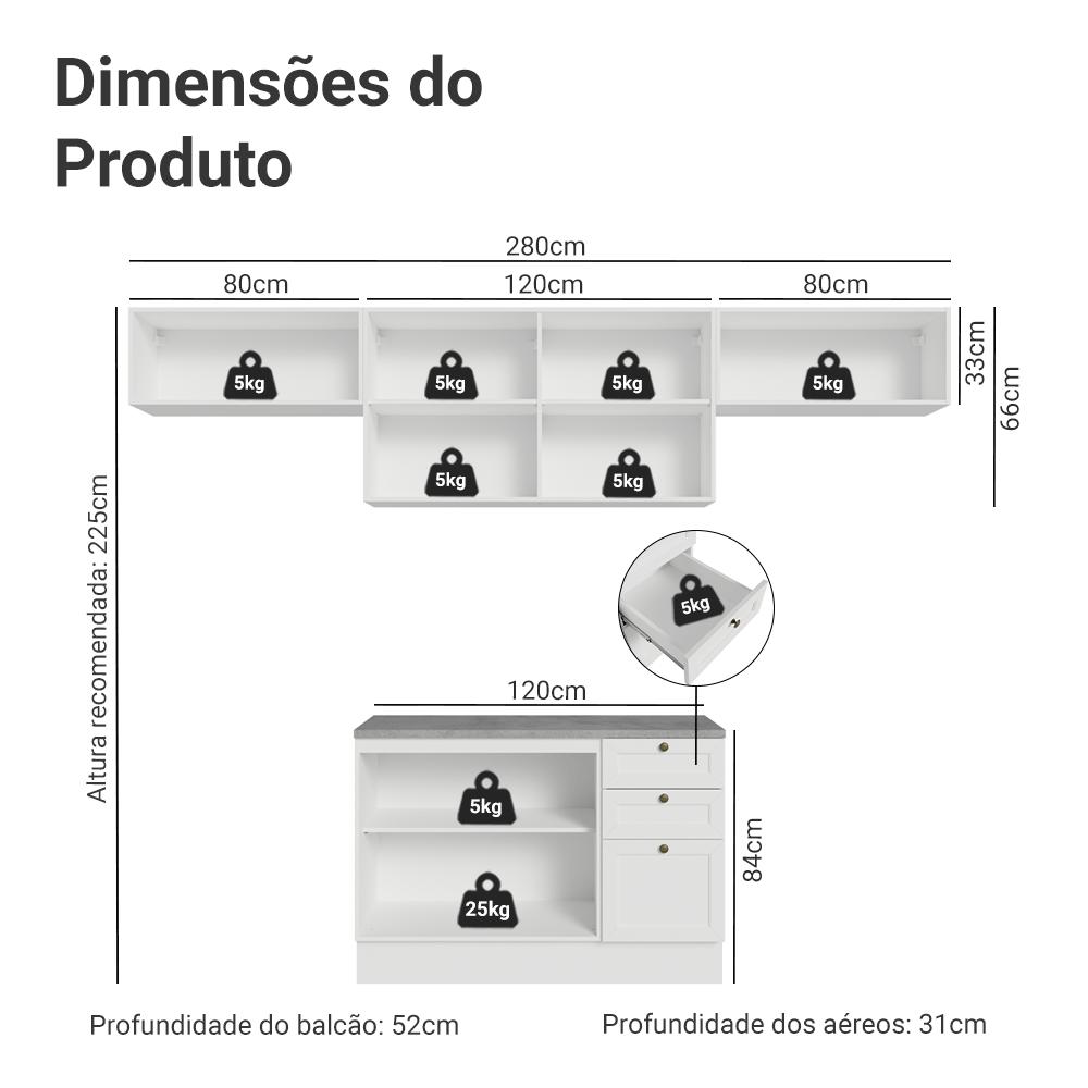 A Cozinha Completa da Linha Vik da Madesa é a escolha ideal para quem deseja uma cozinha elegante e funcional. Com 280 cm de largura, essa cozinha oferece uma organização inteligente e um design que combina o charme do estilo americano clássico com toques modernos e sofisticados, proporcionando um ambiente prático e cheio de estilo.Além disso, a linha Vik é funcional em cada detalhe. As portas possuem dobradiças com amortecimento, garantindo um fechamento suave e silencioso, enquanto as gavetas permitem abertura total, garantindo muito mais facilidade. O acabamento de alta resistência da estrutura e das frentes é na cor Branca e possui uma textura suave ao toque. O destaque fica por conta dos puxadores ponto em ouro envelhecido, feitos com metal resistente, trazem personalidade e um charme único.Os armários e balcões foram cuidadosamente projetados para aproveitar ao máximo o espaço. Além disso, os aéreos com porta basculante possuem um sistema de pistão a gás que mantém a porta suspensa quando aberta, proporcionando mais praticidade e segurança no uso diário.Medidas totais:Altura: 225 cmLargura: 280 cmProfundidade: 52 cm (módulos inferiores) 31 cm (aéreos)O que você recebe:1 Aéreo de 120 cm com 2 portas1 Balcão com 2 portas e 3 gavetas (Acompanha tampo)2 Aéreos de 80 cm com 1 porta basculanteCódigo do produto: GRVK28000109É Importante saber:As imagens são meramente ilustrativas; os eletros e a decoração não acompanham o produto;A Madesa não oferece serviço de montagem;Produto acompanha manual e ferragens necessárias.A Madesa se dedica à sustentabilidade: temos uma usina própria que gera energia para uma de nossas fábricas, priorizamos fornecedores responsáveis e reciclamos plásticos na produção. Também investimos no desenvolvimento dos colaboradores e em ações sociais.