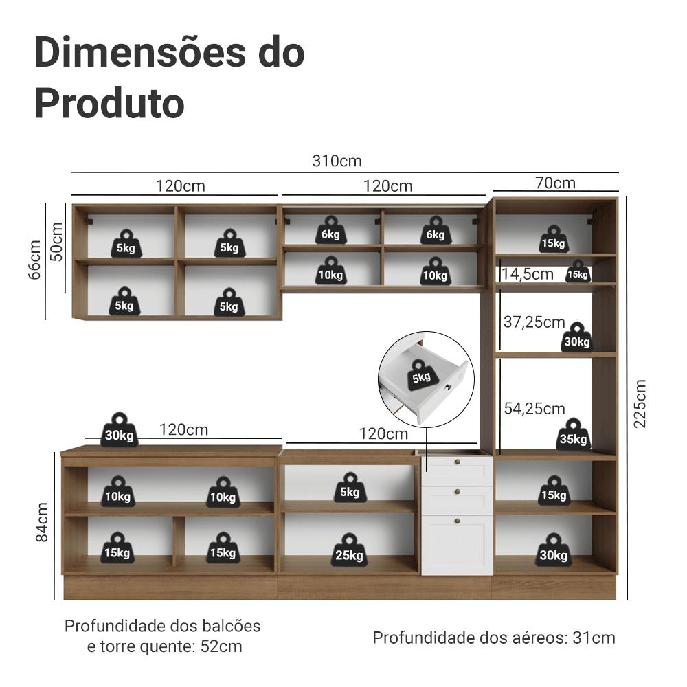 A Cozinha Completa da Linha Vik da Madesa possui 310 cm de largura e une funcionalidade e um design clássico com elementos modernos. Um dos grandes destaques dessa cozinha é o armário aéreo com vidro reflex, que adiciona um toque de sofisticação e modernidade ao ambiente.Além disso, a linha Vik é funcional em cada detalhe. As portas possuem dobradiças com amortecimento, garantindo um fechamento suave e silencioso, enquanto as gavetas permitem abertura total. O acabamento de alta resistência da estrutura é em tom amadeirado Rustic e das frentes em Branco e possui uma textura suave ao toque. O destaque fica por conta dos puxadores ponto em ouro envelhecido, feitos com metal resistente, trazem personalidade e um charme único.O balcão de 120 cm tem o espaço adequado para a instalação de pia. Além disso, o aéreo possui porta basculante com sistema de pistão a gás que mantém a porta suspensa quando aberta, proporcionando mais praticidade e segurança no uso diário.Medidas totais:Altura: 225 cmLargura: 310 cmProfundidade: 52 cm (módulos inferiores) 31 cm (aéreos)O que você recebe:Um (1) Aéreo de 120 cm com duas (2) portasUm (1) Balcão de 120 cm com duas (2) portas e tampoUm (1) Aéreo de 120 cm com duas (2) portas de correr de vidro reflexUm (1) Balcão de 120 cm com duas (2) portas e três (3) gavetas (Não acompanha tampo)Uma (1) Torre quente de 70 cm com três (3) portas, sendo uma delas basculanteCódigo do produto: GRVK3100016EÉ Importante saber:As imagens são meramente ilustrativas; os eletros e a decoração não acompanham o produto;A Madesa não oferece serviço de montagem;Produto acompanha manual e ferragens necessárias.A Madesa se dedica à sustentabilidade: temos uma usina própria que gera energia para uma de nossas fábricas, priorizamos fornecedores responsáveis e reciclamos plásticos na produção. Também investimos no desenvolvimento dos colaboradores e em ações sociais.