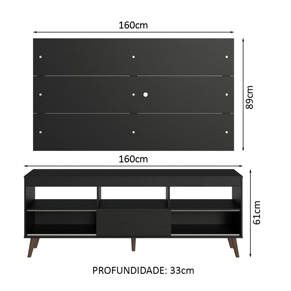 Transforme sua sala de estar em um ambiente mais harmonioso e sofisticado com o Rack e Painel para TV Detroit, da Madesa.Muito prático e espaçoso, o rack conta com cinco nichos e uma porta deslizante que auxiliam na organização dos itens decorativos, aparelhos eletrônicos e tudo mais que você queira armazenar.Destacando-se pela sua elegância, os pés em formato cônico não apenas aumentam a altura do móvel, mas também oferecem uma ótima estabilidade e deixam o conjunto ainda mais charmoso.O painel comporta televisores de até 65 polegadas e é destacado do rack, o que permite que a altura seja ajustada conforme a sua escolha. Além disso, possui espaço para a passagem de cabos, facilitando a organização do dos fios.Para completar, os móveis possuem acabamento preto em Pintura Poliéster ecológica, com sete camadas que garantem maior durabilidade.Itens inclusos:- Um (1) Rack de 61 cm de altura x 160 cm de largura x 33 cm de profundidade- Um (1) Painel de 89 cm de altura x 160 cm de larguraCódigo do produto: MDES0200198N5ZObs:- Imagens meramente ilustrativas- A Madesa não disponibiliza serviço de montagem- O produto segue com manual e todas as ferragens necessárias para a montagem1 – O produto vem montado? Se não, vocês realizam a montagem?R.: A Madesa não disponibiliza serviço de montagem. Todos os produtos seguem com manual de instalação e as ferragens necessárias. Alguns produtos possuem vídeo explicando o passo a passo da montagem.2 – Vocês possuem loja física? Posso retirar meu produto em mãos?R.: Não possuímos loja física, apenas loja virtual. Confira as opções de envio ao colocar o seu CEP.3 – Qual é o valor do envio? Posso pagar separadamente?R.: O valor do envio é calculado com base no peso e volume do produto, e no CEP de destino. Você pode calcular o valor e prazo de entrega no simulador.4 – A Madesa entrega em todo Brasil? Como é feita a entrega?R.: Sim, entregamos no Brasil inteiro através de transportadoras parceiras.A Madesa se dedica à sustentabilidade com várias iniciativas: temos uma usina própria para gerar energia que abastece uma de nossas fábricas. Selecionamos nossos fornecedores, priorizando aqueles que possuem um compromisso com a sustentabilidade e proteção do meio ambiente. Todo o plástico utilizado no setor produtivo é proveniente de reciclagem e as suas sobras são encaminhadas ao fornecedor que os recicla. Também investimos no desenvolvimento contínuo de nossos colaboradores e em ações educacionais que beneficiem a comunidade.