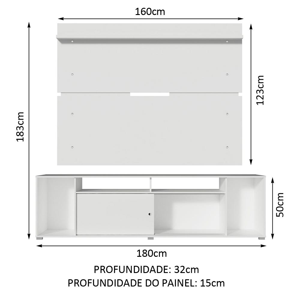 A combinação do Rack Cancun com o Painel 2101 é a escolha ideal para renovar a sua sala de estar com toda a qualidade que os produtos da Madesa oferecem.Com design imponente, o rack conta com uma porta de correr e seis nichos. É perfeito para deixar tudo organizado, dos aparelhos eletrônicos até objetos decorativos, livros e revistas.O painel comporta TV de até 65 polegadas e conta com abertura para passar os fios. Contempla também uma prateleira na parte superior, perfeita para objetos decorativos. Por ser separado do rack, pode ser fixado na altura desejada.Tanto o rack quanto o painel possuem acabamento branco. O processo é feito em Poliéster Protetor com 7 camadas, detalhe que confere mais durabilidade e qualidade aos produtos. Além disso, é ecológico, isento de vapores prejudiciais à atmosfera.Imagens meramente ilustrativas.Itens inclusos:- Um (1) Rack de 50 cm de altura x 180 cm de largura x 32 cm de profundidade- Um (1) Painel de 123 cm de altura x 160 cm de largura x 15 cm de profundidadeCódigo do produto: MDES0200230909Obs: A Madesa não disponibiliza serviço de montagem. O produto segue com manual de instalação e todas as ferragens necessárias para sua montagem.1-O produto é novo ou usado?R.: Todos os produtos da Madesa são novos, enviados da nossa fábrica diretamente para as casas de nossos clientes.2-O produto vem montado? Se não, vocês realizam a montagem?R.: A Madesa não disponibiliza serviço de montagem. Todos os produtos seguem com manual de instalação e as ferragens necessárias. Alguns produtos possuem vídeo explicando o passo a passo da montagem.3-Vocês possuem loja física? Posso retirar meu produto em mãos?R.: Não possuímos loja física, apenas loja virtual. Confira as opções de envio ao colocar o seu CEP.4-Qual é o valor do envio? Posso pagar separadamente?R.: O valor do envio é calculado com base no peso e volume do produto, e no CEP de destino. Você pode calcular o valor e prazo de entrega no simulador.5-A Madesa entrega em todo Brasil? Como é feita a entrega?R.: Sim, entregamos no Brasil inteiro através de transportadoras parceiras.6-O produto acompanha Nota Fiscal?R.: Sim, todos os produtos são entregues com suas respectivas notas fiscais.7-Os produtos possuem garantia?R.: Sim. A Madesa oferece 3 meses de garantia para defeitos de fabricação.A Madesa se dedica à sustentabilidade com várias iniciativas: temos uma usina própria para gerar energia que abastece uma de nossas fábricas. Selecionamos nossos fornecedores, priorizando aqueles que possuem um compromisso com a sustentabilidade e proteção do meio ambiente. Todo o plástico utilizado no setor produtivo é proveniente de reciclagem e as suas sobras são encaminhadas ao fornecedor que os recicla. Também investimos no desenvolvimento contínuo de nossos colaboradores e em ações educacionais que beneficiem a comunidade.
