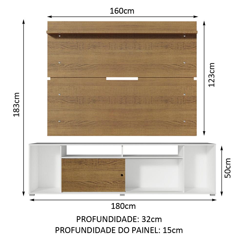 A combinação do Rack Cancun com o Painel 2101 é a escolha ideal para renovar a sua sala de estar com toda a qualidade que os produtos da Madesa oferecem.Com design imponente, o rack conta com uma porta de correr e seis nichos. É perfeito para deixar tudo organizado, dos aparelhos eletrônicos até objetos decorativos, livros e revistas.O painel comporta TV de até 65 polegadas e conta com abertura para passar os fios. Contempla também uma prateleira na parte superior, perfeita para objetos decorativos. Por ser separado do rack, pode ser fixado na altura desejada.A estrutura do rack é branca. A porta do rack e o painel possuem acabamento no padrão amadeirado Rustic. O processo é feito em Poliéster Protetor com 7 camadas, detalhe que confere mais durabilidade e qualidade aos produtos. Além disso, é ecológico, isento de vapores prejudiciais à atmosfera.Imagens meramente ilustrativas.Itens inclusos:- Um (1) Rack de 50 cm de altura x 180 cm de largura x 32 cm de profundidade- Um (1) Painel de 123 cm de altura x 160 cm de largura x 15 cm de profundidadeCódigo do produto: MDES0200239B5ZObs: A Madesa não disponibiliza serviço de montagem. O produto segue com manual de instalação e todas as ferragens necessárias para sua montagem.1-O produto é novo ou usado?R.: Todos os produtos da Madesa são novos, enviados da nossa fábrica diretamente para as casas de nossos clientes.2-O produto vem montado? Se não, vocês realizam a montagem?R.: A Madesa não disponibiliza serviço de montagem. Todos os produtos seguem com manual de instalação e as ferragens necessárias. Alguns produtos possuem vídeo explicando o passo a passo da montagem.3-Vocês possuem loja física? Posso retirar meu produto em mãos?R.: Não possuímos loja física, apenas loja virtual. Confira as opções de envio ao colocar o seu CEP.4-Qual é o valor do envio? Posso pagar separadamente?R.: O valor do envio é calculado com base no peso e volume do produto, e no CEP de destino. Você pode calcular o valor e prazo de entrega no simulador.5-A Madesa entrega em todo Brasil? Como é feita a entrega?R.: Sim, entregamos no Brasil inteiro através de transportadoras parceiras.6-O produto acompanha Nota Fiscal?R.: Sim, todos os produtos são entregues com suas respectivas notas fiscais.7-Os produtos possuem garantia?R.: Sim. A Madesa oferece 3 meses de garantia para defeitos de fabricação.A Madesa se dedica à sustentabilidade com várias iniciativas: temos uma usina própria para gerar energia que abastece uma de nossas fábricas. Selecionamos nossos fornecedores, priorizando aqueles que possuem um compromisso com a sustentabilidade e proteção do meio ambiente. Todo o plástico utilizado no setor produtivo é proveniente de reciclagem e as suas sobras são encaminhadas ao fornecedor que os recicla. Também investimos no desenvolvimento contínuo de nossos colaboradores e em ações educacionais que beneficiem a comunidade.