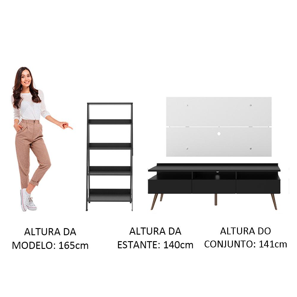 O kit com Rack Londres, Painel de TV e Estante Escada é a escolha perfeita para deixar o espaço do seu jeito!O Rack Londres possui três portas, nichos abertos para os aparelhos eletrônicos, além de espaço para passar os fios. Sem contar com os pés retrô em madeira maciça, um charme a mais.Já o Painel comporta TVs de até 55 polegadas e a estante escada possui divisórias bem dispostas e bastante espaço para organizar livros, revistas e objetos de decoração.Caso não queira usar as peças juntas, a estante em design cavalete é uma peça totalmente versátil, que combina em qualquer ambiente: sala, escritório, cozinha, despensa ou quarto.O acabamento do rack e da estante é preto e o do painel é branco. Feitos em Pintura Poliéster de alta resistência, possuem 7 camadas de proteção resistentes a álcool, água e calor. O processo é ecológico, isento de vapores que vão para a atmosfera.Imagem meramente ilustrativa.Itens inclusos:- Um (1) Rack com 58 cm de altura x 160 cm de largura x 36 cm de profundidade- Um (1) Painel para TV com 72 cm de altura x 136 cm de largura.- Uma (1) Estante com 140 cm de altura x 61 cm de largura x 39 cm de profundidade.Código do produto: MDES03000177Obs.: A Madesa não disponibiliza serviço de montagem. O produto segue com manual de instalação e todas as ferragens necessárias para sua montagem1-O produto é novo ou usado?R.: Todos os produtos da Madesa são novos, enviados da nossa fábrica diretamente para as casas de nossos clientes.2-O produto vem montado? Se não, vocês realizam a montagem?R.: A Madesa não disponibiliza serviço de montagem. Todos os produtos seguem com manual de instalação e as ferragens necessárias. Alguns produtos possuem vídeo explicando o passo a passo da montagem.3-Vocês possuem loja física? Posso retirar meu produto em mãos?R.: Não possuímos loja física, apenas loja virtual. Confira as opções de envio ao colocar o seu CEP.4-Qual é o valor do envio? Posso pagar separadamente?R.: O valor do envio é calculado com base no peso e volume do produto, e no CEP de destino. Você pode calcular o valor e prazo de entrega no simulador.5-A Madesa entrega em todo Brasil? Como é feita a entrega?R.: Sim, entregamos no Brasil inteiro através de transportadoras parceiras.6-O produto acompanha Nota Fiscal?R.: Sim, todos os produtos são entregues com suas respectivas notas fiscais.7-Os produtos possuem garantia?R.: Sim. A Madesa oferece 3 meses de garantia para defeitos de fabricação.A Madesa se dedica à sustentabilidade com várias iniciativas: temos uma usina própria para gerar energia que abastece uma de nossas fábricas. Selecionamos nossos fornecedores, priorizando aqueles que possuem um compromisso com a sustentabilidade e proteção do meio ambiente. Todo o plástico utilizado no setor produtivo é proveniente de reciclagem e as suas sobras são encaminhadas ao fornecedor que os recicla. Também investimos no desenvolvimento contínuo de nossos colaboradores e em ações educacionais que beneficiem a comunidade.