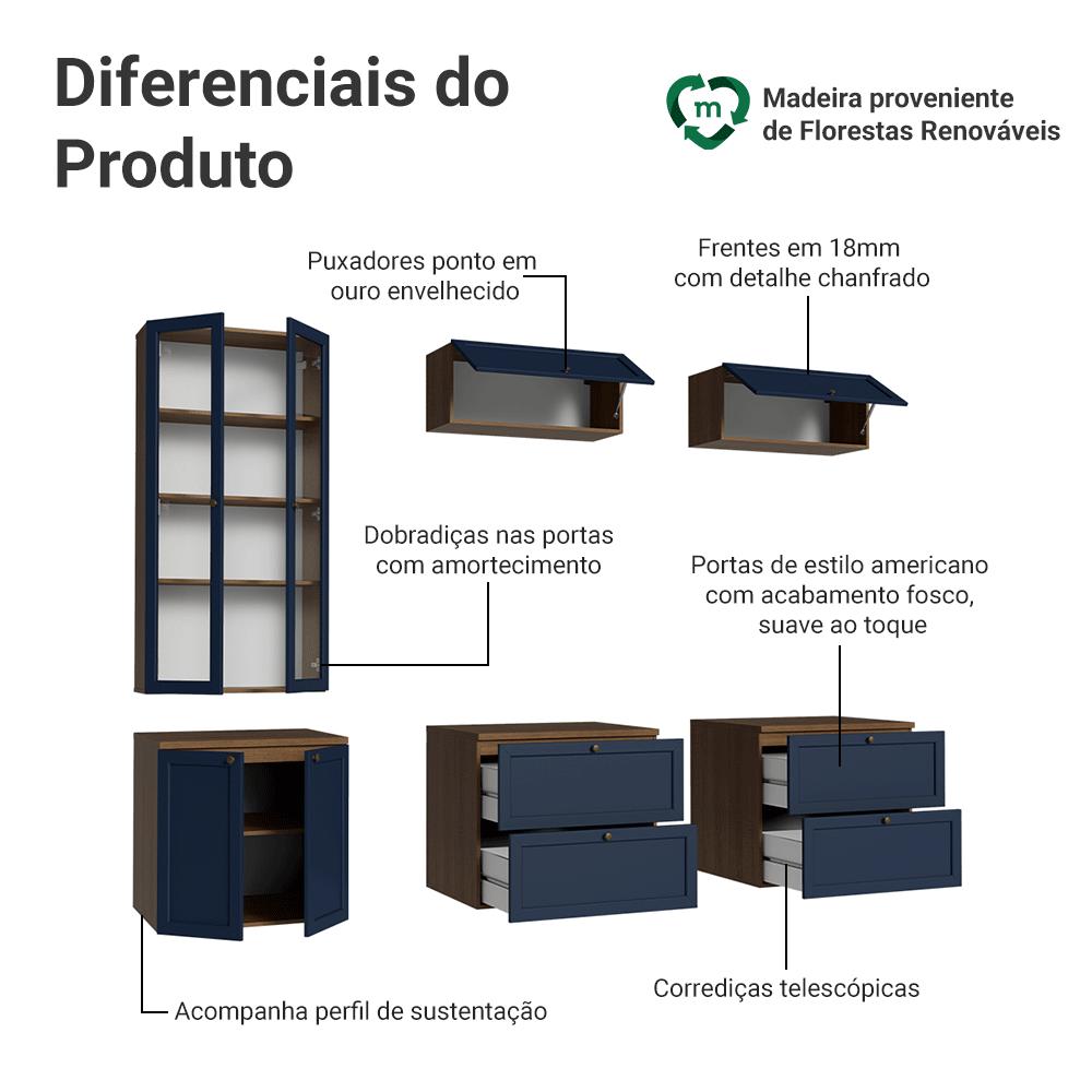 A nova estante da Linha Vik Madesa é a escolha ideal para quem deseja um móvel completo que combine estilo, funcionalidade e aproveitamento inteligente do espaço.O conjunto é composto por gavetas e armários amplos, um armário com portas de vidro, que pode ser usado como cristaleira ou livreiro. Essa combinação permite acomodar uma TV, organizar livros, louças e itens decorativos com facilidade. O acabamento da estrutura é no tom amadeirado Rustic e das frentes em Azul, possui alta resistência, trazendo um visual sofisticado e textura suave ao toque.A Linha Vik se destaca pelos detalhes que fazem toda a diferença: portas com molduras inspiradas no estilo americano, puxadores ponto em ouro envelhecido, dobradiças com amortecimento e gavetas com corrediças que permitem abertura total. Além disso, as portas basculantes possuem um sistema de pistão a gás, permanecem suspensas quando abertas, proporcionando mais segurança. Um móvel completo, que combina elegância e funcionalidade para valorizar cada detalhe da sua casa.O que você recebe:- Um Balcão com duas portas- Dois Balcões com duas gavetas em cada- Dois Armários Aéreos com porta basculante- Um Armário com duas portas de vidro- Manual de montagem e ferragensMedidas totais:- 225cm de altura- 230cm de largura- 52cm de profundidade nos balcões e 31cm nos aéreos e cristaleiraCódigo do produto: MDES060001M1É importante saber:- Material: MDP- Imagens meramente ilustrativas, a decoração não acompanha o produto.- A Madesa não disponibiliza serviço de montagemA Madesa se dedica à sustentabilidade com várias iniciativas: temos uma usina própria que gera energia para uma das fábricas. Priorizamos fornecedores responsáveis com o meio ambiente. Todo o plástico utilizado na produção é reciclado, e as sobras também são reaproveitadas. Investimos no desenvolvimento de nossos colaboradores e em ações que beneficiem a comunidade.