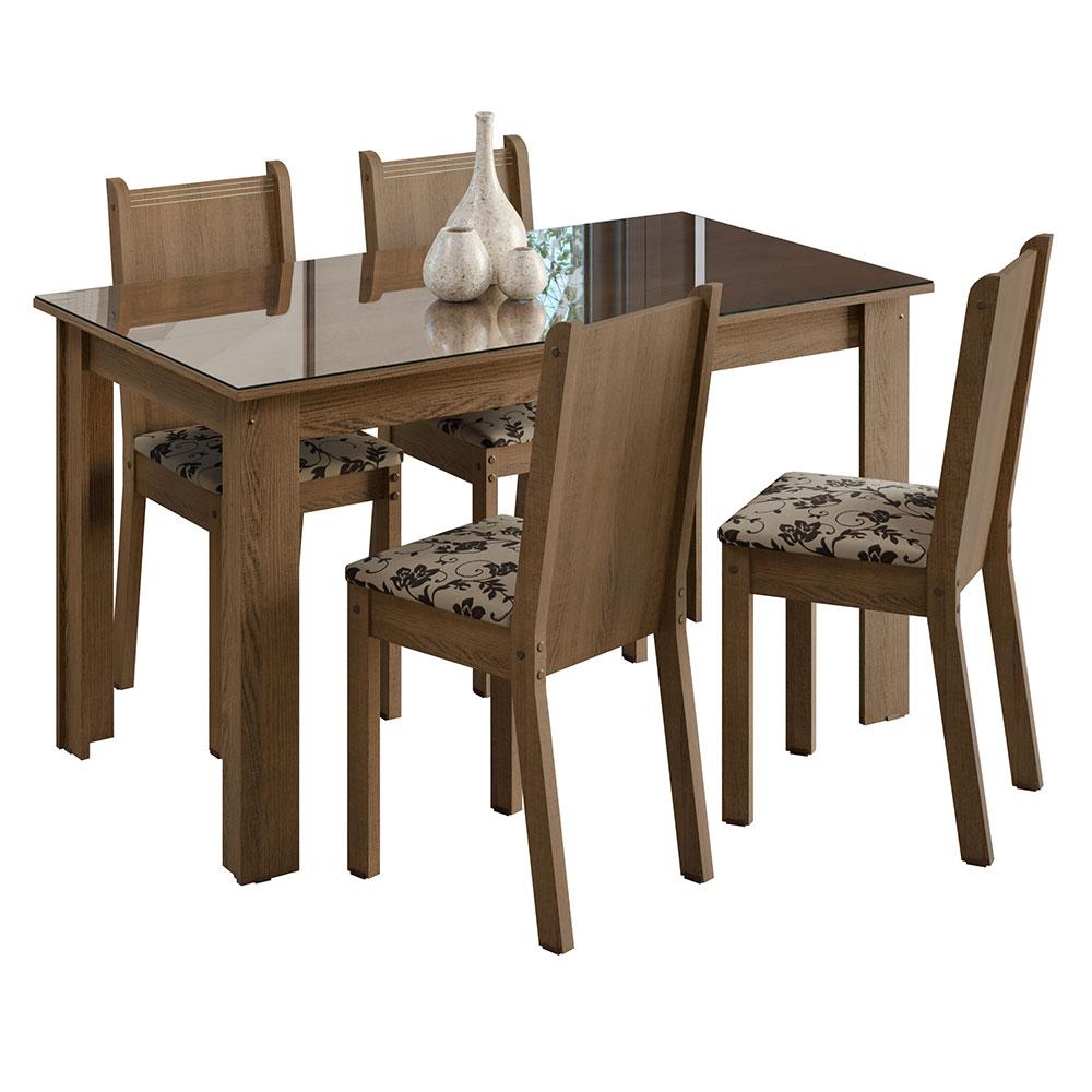Conjunto Sala de Jantar Mesa Tampo de Vidro 4 Cadeiras Rustic/Bege Marrom Kiara Madesa