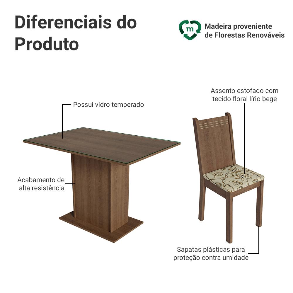 Conjunto Sala de Jantar Mesa Tampo de Vidro 4 Cadeiras Rustic/Lírio Bege Camélia Madesa