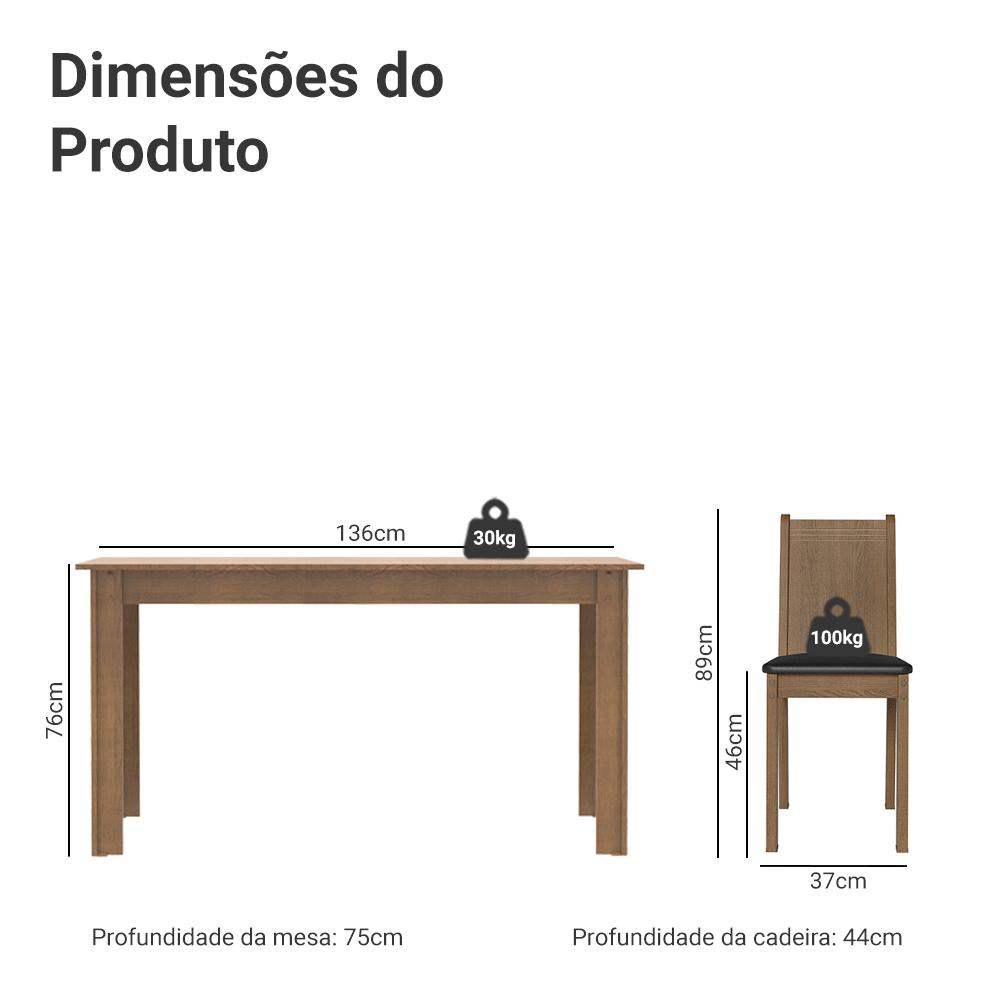 O conjunto de mesa e cadeiras Analu da Madesa vai dar uma nova cara para o seu ambiente.A mesa com pés estruturais é robusta e segura. O espaço disponível acomoda bem até seis pessoas. É uma grande opção tanto para a cozinha quanto para a sala de jantar.As cadeiras são fabricadas em MDF/MDP e possuem encosto de madeira e assento estofado em material Sintético Preto, com toque suave e fácil de harmonizar com as mais variadas decorações.Para completar, o acabamento de alta resistência é no padrão amadeirado Rustic.Imagens meramente ilustrativas. O conjunto é composto pela mesa e seis cadeiras.Itens inclusos:- Uma (1) mesa com 76 cm de altura e tampo em MDP de 136 cm x 75 cm- Seis (6) cadeiras de 89 cm de altura com encosto em madeira e assento estofadoCódigo do produto: MDJA0601185ZPTObs.: A Madesa não disponibiliza serviço de montagem. O produto segue com manual de instalação e todas as ferragens necessárias para sua montagem.A Madesa se dedica à sustentabilidade com várias iniciativas: temos uma usina própria para gerar energia que abastece uma de nossas fábricas. Selecionamos nossos fornecedores, priorizando aqueles que possuem um compromisso com a sustentabilidade e proteção do meio ambiente. Todo o plástico utilizado no setor produtivo é proveniente de reciclagem e as suas sobras são encaminhadas ao fornecedor que os recicla. Também investimos no desenvolvimento contínuo de nossos colaboradores e em ações educacionais que beneficiem a comunidade.