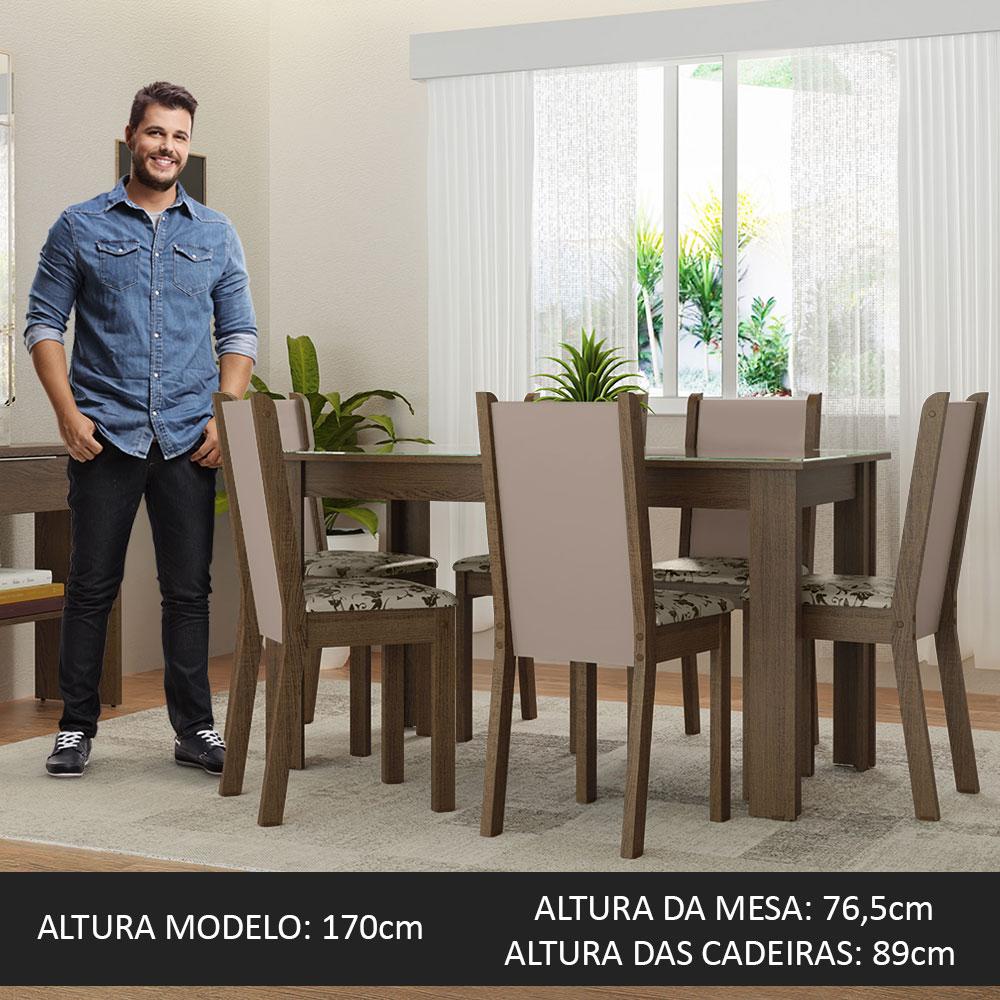 Conjunto Sala de Jantar Mesa Tampo de Vidro 6 Cadeiras Rustic/Crema/Bege Marrom Heloísa Madesa