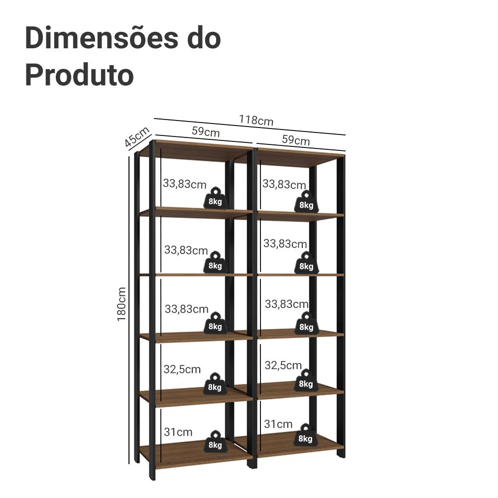 O móvel perfeito para auxiliar na organização da sua despensa ou cozinha! Confira esta Estante Multiuso da Madesa.As dez prateleiras amplas deixam seu espaço mais funcional e versátil. Permite armazenar louças, potes, eletros, mantimentos e muito mais.Seu acabamento em alta resistência combina os tons amadeirado Rustic e preto, dando um toque a mais de sofisticação ao ambiente.Medidas totais:- 180 cm de altura- 118 cm de largura- 45 cm de profundidadeO que você recebe:- Duas (2) Estantes abertas com cinco (5) prateleiras cada- Ferragens e manual de montagemCódigo do produto: MDMU0200097KÉ bom saber:- As imagens são meramente ilustrativas- A Madesa não oferece serviço de montagem- Por segurança, é obrigatório fixar o móvel na parede- Estruturas laterais em MDP com pintura em preto texturizadoA Madesa se dedica à sustentabilidade com várias iniciativas: temos uma usina própria para gerar energia que abastece uma de nossas fábricas. Selecionamos nossos fornecedores, priorizando aqueles que possuem um compromisso com a sustentabilidade e proteção do meio ambiente. Todo o plástico utilizado no setor produtivo é proveniente de reciclagem e as suas sobras são encaminhadas ao fornecedor que os recicla. Também investimos no desenvolvimento contínuo de nossos colaboradores e em ações educacionais que beneficiem a comunidade.