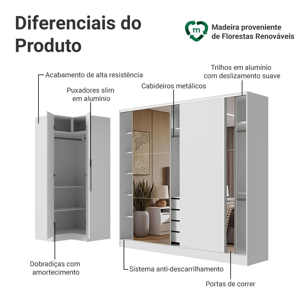 A Linha Neo foi criada para oferecer soluções inteligentes de organização. Com ferragens de alta qualidade, como dobradiças com amortecimento, cabideiros metálicos, puxadores slim em alumínio e acabamento branco de alta resistência.O Guarda-Roupa Royale, por sua vez, é fabricado em 100% em MDF, conta com três portas de correr, sendo duas com espelhos que ampliam o ambiente e otimizam o espaço. Seu interior é amplo e bem distribuído, com prateleiras, nichos, três cabideiros e quatro gavetas espaçosas, oferecendo capacidade para roupas, acessórios e muito mais.Com Neo e Royale juntos, você tem o melhor em design e funcionalidade, em um kit que atende todas as necessidades e transforma o quarto em um espaço elegante, organizado e completo.Medidas totais:- 218 cm de altura- 421 cm de largura- 56 cm de profundidade Guarda-Roupa Neo e 55 cm Guarda-Roupa RoyaleO que você recebe:- Um Guarda-Roupa Royale de 231 cm com três portas de correr com espelho- Um Guarda-Roupa Neo de Canto com duas portasCódigo do produto: MDNE42100209É importante saber:- Material: MDP/MDF- Imagens meramente ilustrativas, a decoração não acompanha o produto- A Madesa não disponibiliza serviço de montagem- O produto segue com manual de instalação e todas as ferragens necessárias para sua montagemA Madesa se dedica à sustentabilidade com várias iniciativas: temos uma usina própria que gera energia para uma das fábricas. Priorizamos fornecedores responsáveis com o meio ambiente. Todo o plástico utilizado na produção é reciclado, e as sobras também são reaproveitadas. Investimos no desenvolvimento de nossos colaboradores e em ações que beneficiem a comunidade.