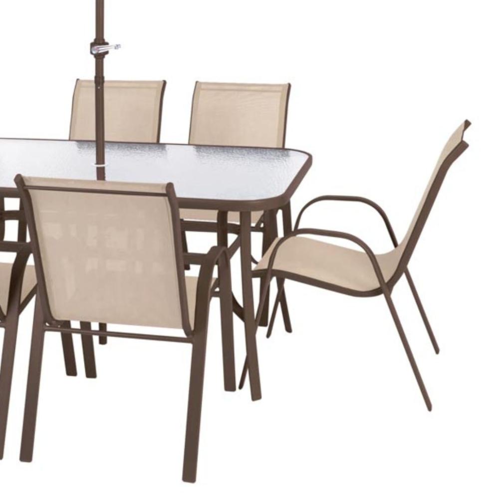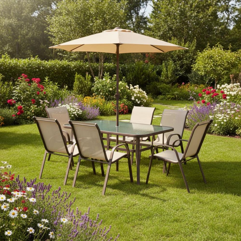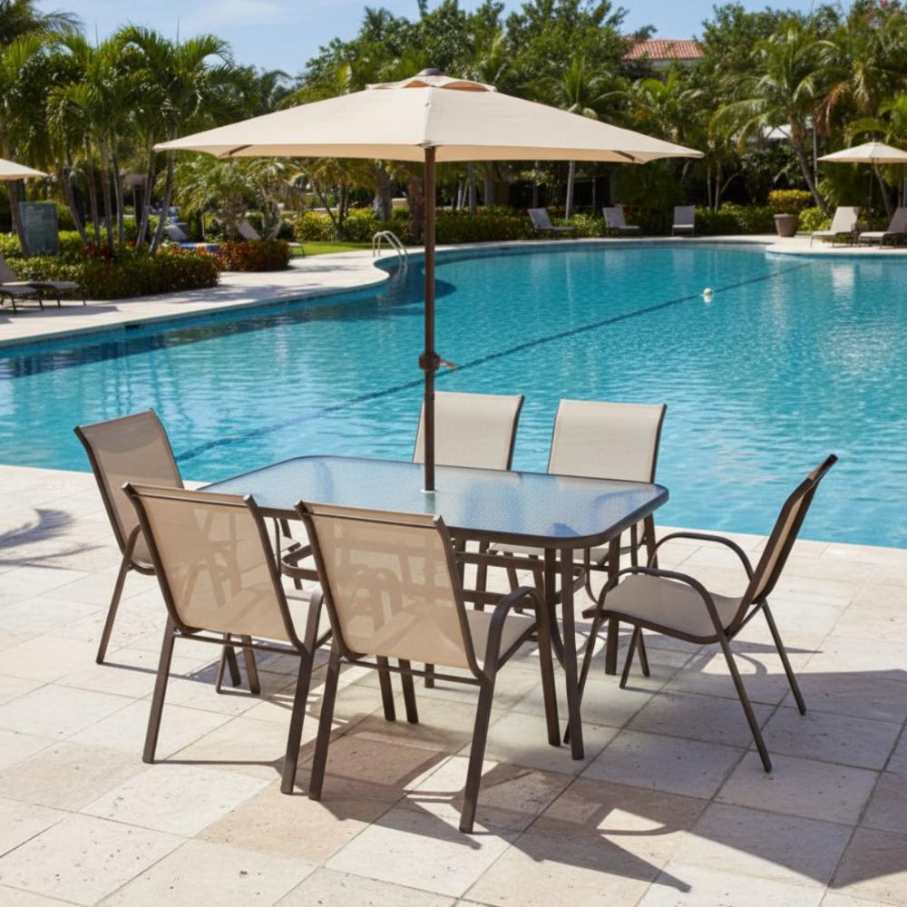 Conjunto Jardim Texas Com Mesa Guarda-sol e Cadeiras Mor Leve praticidade e sofisticação para sua área externa com o Conjunto Texas da Mor Life! Ideal para reunir a família e os amigos, ele conta com 6 cadeiras confortáveis, mesa com tampo de vidro e um guarda-sol com proteção FPS 35. A estrutura em aço garante durabilidade, enquanto o tecido textilene das cadeiras e o poliéster do guarda-sol oferecem conforto e resistência. Para prolongar a vida útil do produto, mantenha-o em local seco e bem arejado. Evite o uso em dias de chuva, sereno ou ventos fortes. Descrição do produto: Cor predominante: Marrom escuro com bege. Quantidade: 6x Cadeiras. 1x Mesa com tampo de vidro. 1x Guarda-sol com proteção FPS 35. Material: Cadeiras: Com tubos em aço e tecido em textilene. Mesa: Com tubos em aço, tampo em vidro e peças plásticas em polipropileno. Guarda-sol: Com varetas e tubos em aço, peças plásticas em polipropileno e tecido em poliéster. Medidas: Cadeiras (cada): 73,5cm X 54cm X 89cm. Mesa: 1,50m X 90cm X 72cm. Guarda-sol: 2,48m X 2,26m. Capacidade: Cadeiras (cada): 160 kg. Mesa: 75 kg. Imagens meramente ilustrativas, todos os itens que ambientam o produto não estão inclusos.