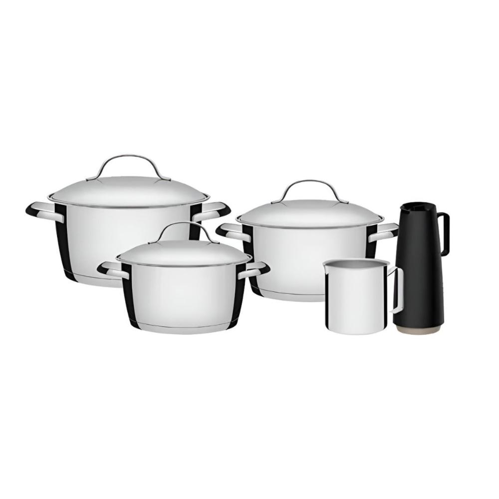 Jogo De Panelas Aço Inox Allegra 5 Peças TramontinaO Jogo de Panelas Tramontina Allegra em Aço Inox com Fundo Triplo e Tampas de Inox 5 Peças vai tornar sua cozinha mais completa! Produzidas totalmente em aço inox, as três caçarolas possuem fundo triplo (aço inox + alumínio + aço inox), característica que distribui o calor de forma uniforme, proporcionando um cozimento mais rápido e deixando os alimentos aquecidos por mais tempo, além de economizar mais energia. Estilosas, possuem acabamento em alto brilho que fazem delas protagonistas na hora de preparar e servir alimentos. Possuem tampa com saída de vapor e encaixe perfeito. Muito fáceis de limpar, possuem desenho sem cantos que facilita a limpeza, além de poderem ser lavadas diariamente na máquina de lavar louças. São ainda panelas versáteis que pode ser utilizadas em diferentes tipos de fogões. O fervedor não é apto para fogõesd e indução. Garanta o seu jogo e prepare as melhores receitas!Descrição do produto:Marca: TramontinaMaterial: Aço InoxLinha Comercial: Allegra e ExataComposição / Quantidade: 5 PeçasRevestimento Interno: Sem revestimentoTipo de Fogão compatíveis: Gás, Elétrico, Vitrocerâmico - resistência elétricaConteúdo:1x Caçarola Funda Allegra em Aço Inox com Fundo Triplo 16cm 1,5L1x Caçarola Funda Allegra em Aço Inox com Fundo Triplo 18cm 2,2L1x Caçarola Funda Allegra em Aço Inox com Fundo Triplo 20cm 3,1L1x Fervedor Allegra em Aço Inox 12cm 1,4L1x Bule Térmico Exata em Plástico Preto com Ampola de Vidro 1 LImagens meramente ilustrativas, todos os itens que ambientam o produto não estão inclusos.
