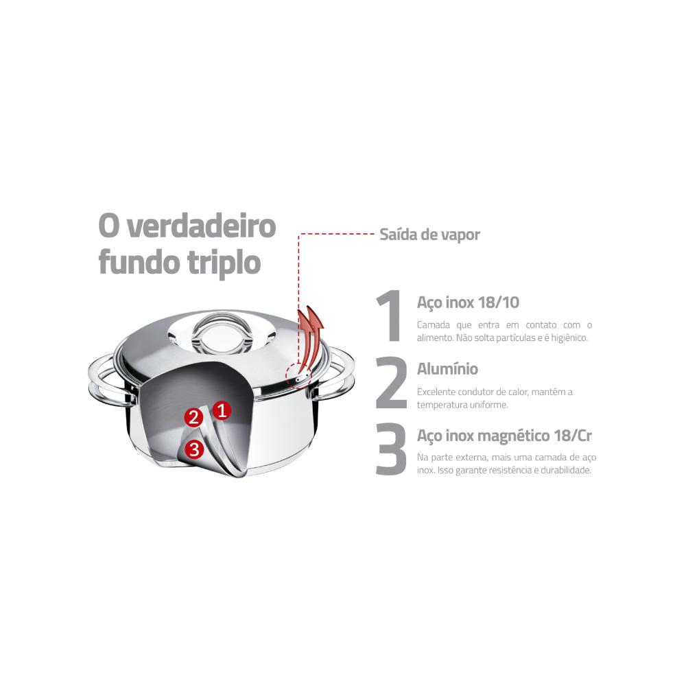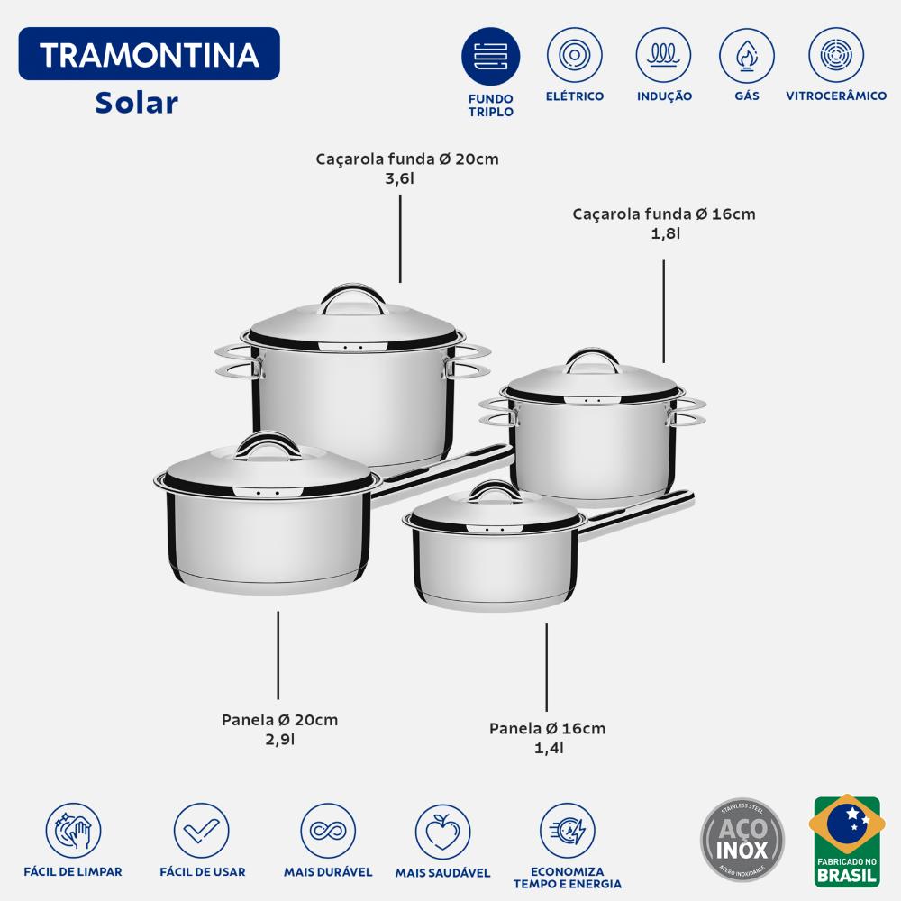 Jogo de Panelas Inox Solar 5 Peças Pegador Massa TramontinaO design clean da linha Solar foi criado para tornar mais simples as tarefas de forno e fogão. O Jogo de Panelas Tramontina Solar em Aço Inox com Fundo Triplo 5 Peças possui um design moderno, com acabamento em alto brilho. O fundo triplo (aço inox + alumínio + aço inox) distribui o calor uniformemente, proporcionando um cozimento mais rápido e uniforme, economizando energia e deixando os alimentos aquecidos por mais tempo. Desenho limpo e sem cantos torna a limpeza mais fácil. Sua tampa tem saída de vapor e encaixe perfeito. Com o Pegador de Massa Tramontina em Aço Inox da linha Utility você tem praticidade na hora de servir qualquer tipo de massa e por ser totalmente em aço inox não solta resíduos nos alimentos mantendo-os saudáveis. É muita praticidade!Descrição do produto:Marca: TramontinaCor: InoxLinha: Solar e Utility Composição/Quantidade: 5 PeçasRevestimento Interno: Sem revestimentoTipo de Fogão: Gás, Elétrico, Indução, Vitrocerâmico - resistência elétricaMáquina de Lavar Louça: SimComposição: 1 Caçarola - Ø 16 cm - 1,8 L1 Caçarola - Ø 20 cm - 3,6 L1 Panela - Ø 16 cm - 1,4 L1 Panela - Ø 20 cm - 2,9 L1 Pegador de massas - 20,8cmImagens meramente ilustrativas, todos os itens que ambientam o produto não estão inclusos.