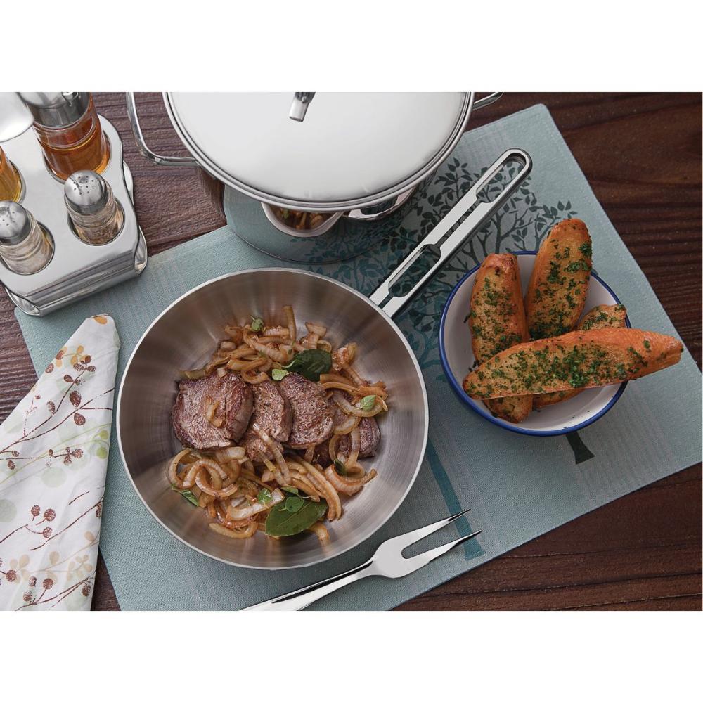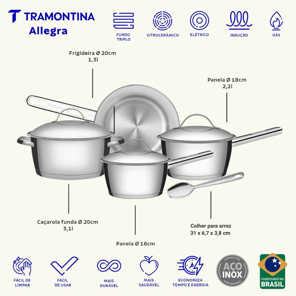 Jogo de Panelas Allegra Inox Fundo Triplo 4 Peças e Colher Tramontina Sua cozinha ficará completa com o Jogo de Panelas Tramontina Allegra em Aço Inox com Fundo Triplo. São peças perfeitas para você preparar diferentes tipos de receitas, das mais simples às mais complexas. Elas apresentam fundo triplo (aço inox + alumínio + aço inox), tecnologia que distribui o calor uniformemente, cozinhando os alimentos mais rápido e economizando energia. São utensílios de muito bom gosto e totalmente produzidos em aço inox. Eles embelezam sua cozinha dando um toque de elegância e estilo. O design moderno também traz tampa com saída de vapor e encaixe perfeito, facilitando o uso. Ideal para as tarefas do dia-a-dia ou para aquela reunião com pessoas especiais. As peças ainda são muito versáteis, podendo ir ao forno e em diferentes tipos de fogões. Descrição do produtoMarca: TramontinaMaterial: Aço Inox com Fundo TriploRevestimento Interno: Sem revestimentoLinha comercial: Allegra e ExtrataQuantidade total: 5 PeçasCompatível com máquina de Lavar Louça: SimTipos de Fogões: Gás, Elétrico, Indução, Vitrocerâmico - resistência elétrica Composição1x Caçarola funda Ø 20cm 3,10l Allegra1x Frigideira Ø 20cm 1,30l Allegra1x Panela Ø 18cm 2,2l Allegra1x Panela Ø 16cm 1,50l Allegra1x Colher para arroz em Aço Inox 31x6,7x3,8cm Extrata Imagens meramente ilustrativas, todos os itens que ambientam o produto não estão inclusos.