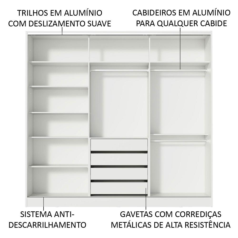 Guarda Roupa Casal 100% MDF Madesa Zurique 3 Portas de Correr de Espelho - Branco
