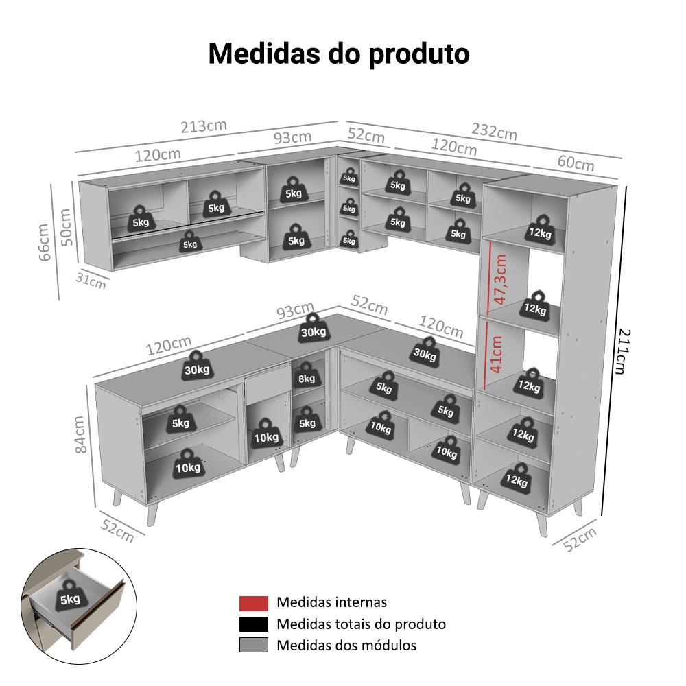 A cozinha completa Nice é ideal para quem deseja unir funcionalidade e estilo no mesmo ambiente.Entre os destaques, estão o armário aéreo com porta de vidro pontilhado, a adega e a torre quente com espaço adequado para forno ou micro-ondas. Os módulos inferiores contam com pés que oferecem estabilidade.O acabamento de alta resistência e os puxadores reforçam o visual elegante, enquanto as corrediças proporcionam abertura total das gavetas. Os balcões acompanham tampo, garantindo praticidade.Medidas totais:- 211 cm de altura- 445 cm de largura- 52 cm de profundidade nos balcões e torre quente e 31 cm nos aéreosInformações técnicas:- Material: MDP- Peso total suportado: 283 kg- Altura dos pés: 16cmO que você recebe:- Uma Torre Quente de 60cm- Um Aéreo de 120cm- Dois Balcões de 120cm- Um Aéreo de Canto com adega acoplada- Um Balcão de Canto- Um aéreo de 120cm com vidro pontilhadoCódigo do produto:XMGCNC4450023BXMGCNC4450027PÉ importante saber:- Imagens meramente ilustrativas, a decoração não acompanha o produto- A Madesa não disponibiliza serviço de montagem- O produto segue com manual de instalação e todas as ferragens necessárias para sua montagemA Madesa possui compromisso com a sustentabilidade. Geramos energia limpa em nossa própria usina, priorizamos fornecedores responsáveis e utilizamos plástico reciclado em nossa produção. Além disso, reinserimos sobras no ciclo de reciclagem e investimos no desenvolvimento de nossos colaboradores e da comunidade.Garantia: Este produto conta com 1 ano de garantia total, sendo 3 meses de garantia legal e 9 meses de garantia contratual. A garantia cobre exclusivamente defeitos de fabricação e vícios ocultos. Não estão cobertos: problemas decorrentes de montagem incorreta, uso inadequado, exposição à umidade, calor ou luz solar direta, modificações no produto ou desgaste natural.