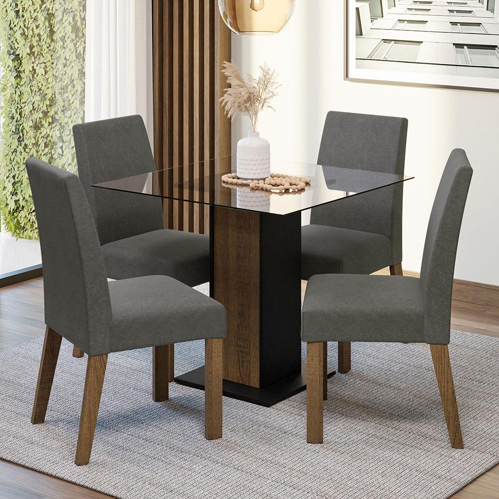 Conjunto Sala de Jantar Mesa Tampo de Vidro 4 Cadeiras Rustic/Preto Ivy Madesa