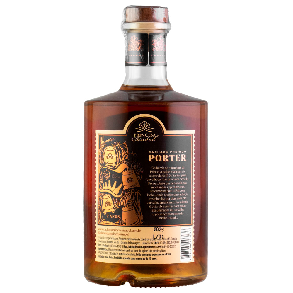 A Cachaça Princesa Isabel Premium Porter é envelhecida em barris de carvalho americano e finalizada em barris de amburana previamente embebidos com cerveja Porter. Esses barris de amburana foram enviados à cervejaria Três Santas, onde envelheceram sua premiada cerveja Porter nas montanhas capixabas.