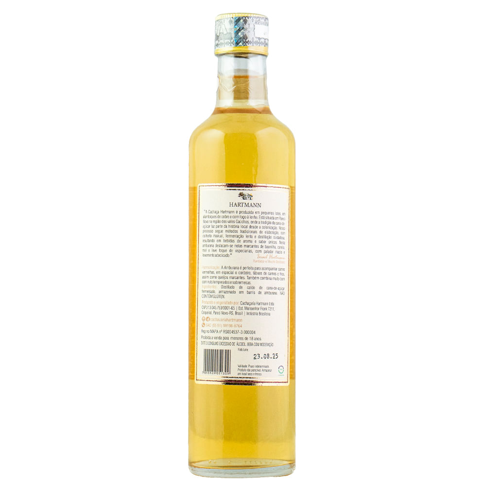 A Cachaça Hartmann Amburana Premium 500ml é uma bebida premium envelhecida por 18 meses em barris de amburana. Com 40% de graduação alcoólica, possui gosto levemente adocicado, que se dá devido ao fundo floral característico dessa madeira, com um toque de aroma de baunilha. A Amburana baixa a acidez do destilado e diminui a sensação alcoólica, tornando-o tão suave quanto um cetim. Quanto à cor, confere a ele um tom amarelado bem claro, mas ainda sim muito vistoso.