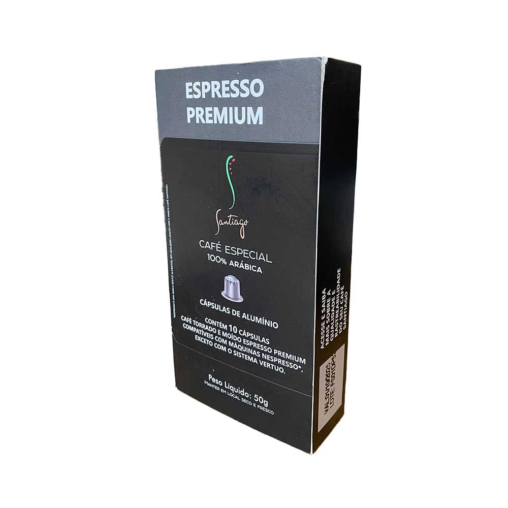 Santiago em cápsula é um café elaborado com grãos 100% arábica, cuidadosamente selecionados e de alta qualidade, cultivados na Fazenda Santiago a altitudes entre 950 e 1100 metros. Este café apresenta um aroma envolvente de chocolate amargo e castanha. No paladar, destaca-se por notas de chocolate amargo, caramelo e castanha, com uma finalização longa e marcante com uma torra moderadamente escura.