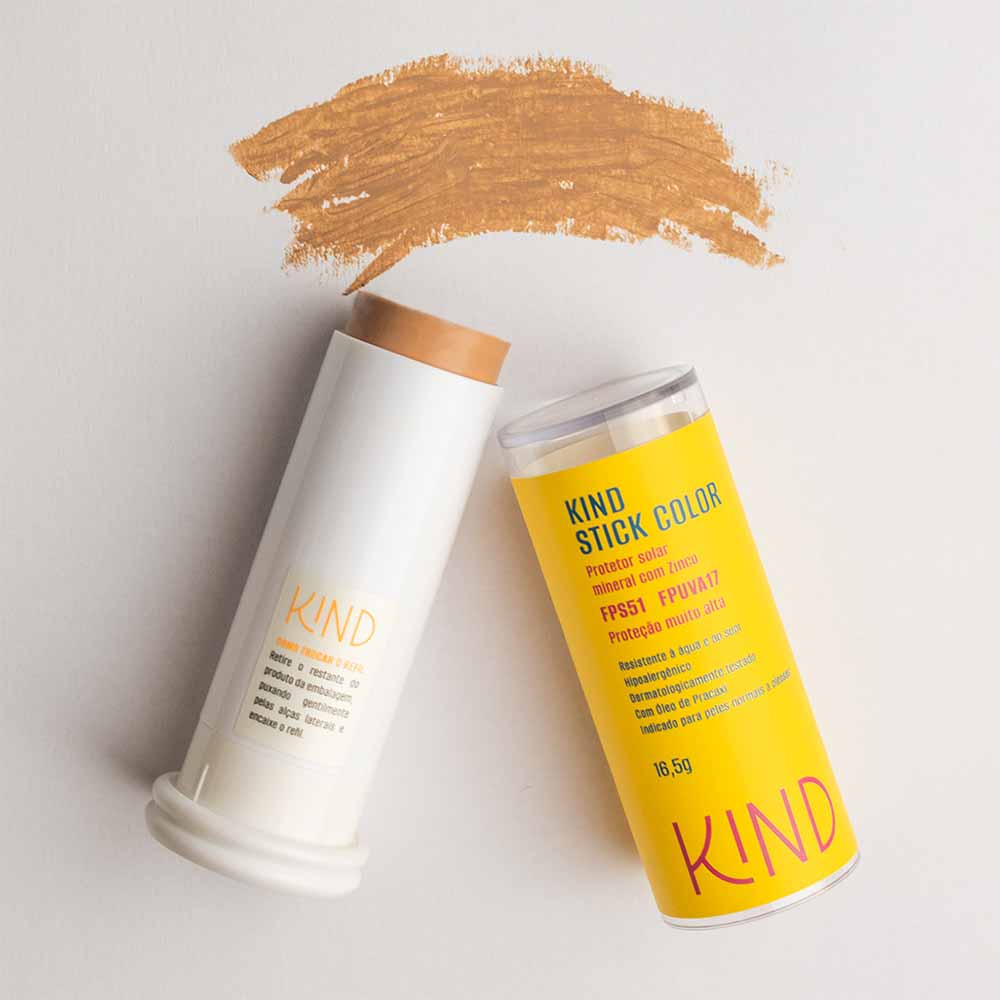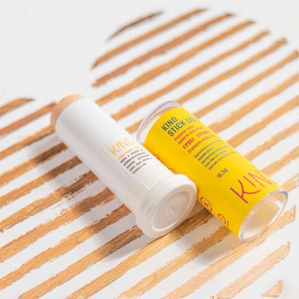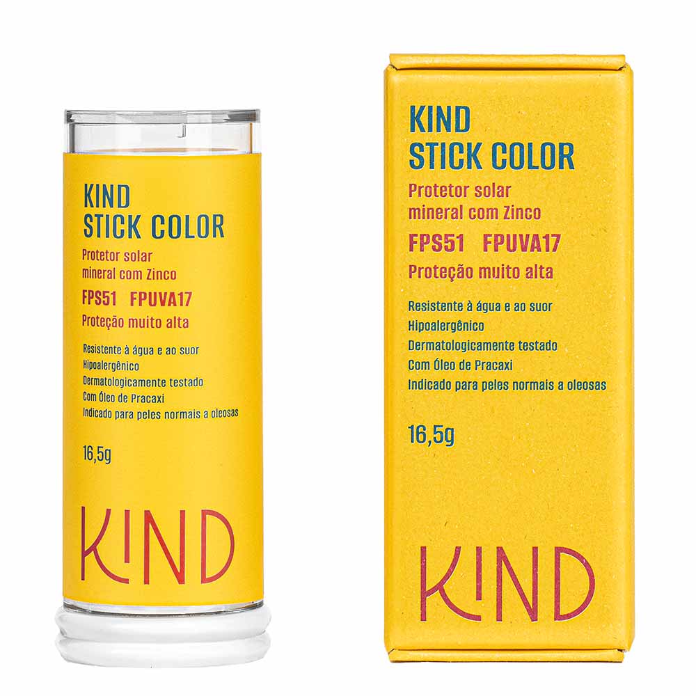 Kind Stick Color é um protetor solar mineral, com FPS 51 e FPUVA 17 e com cor que também funciona como maquiagem facial.