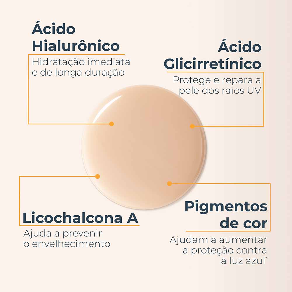 Sua fórmula contém pigmentos de cores que ajudam a aumentar a defesa contra os raios UV e luz azul, além de prevenir o envelhecimento precoce.