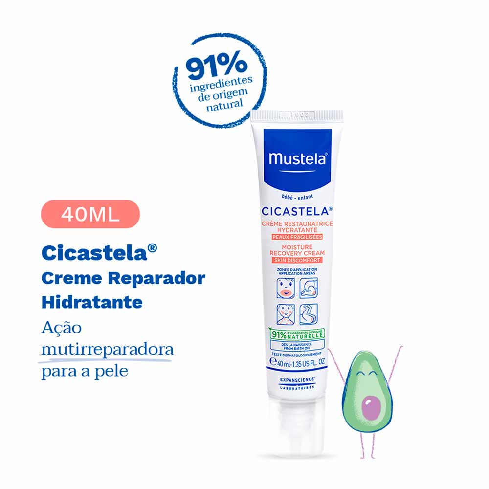 - Creme Hidratante Mustela - Cicastela: Inclui Perseose de Abacate®, ácido hialurônico, pantenol e cobre-zinco, que juntos reparam, hidratam, acalmam e purificam a pele.