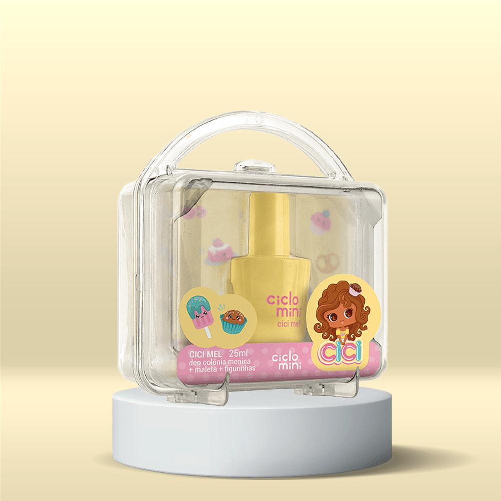 A Cici Mel é pura doçura e fofura! Pensada para meninas românticas, vaidosas e modernas, a maleta vem com 1 deo colônia e 1 cartela de figurinhas exclusiva, perfeita para colecionar e trocar com as amigas.]
