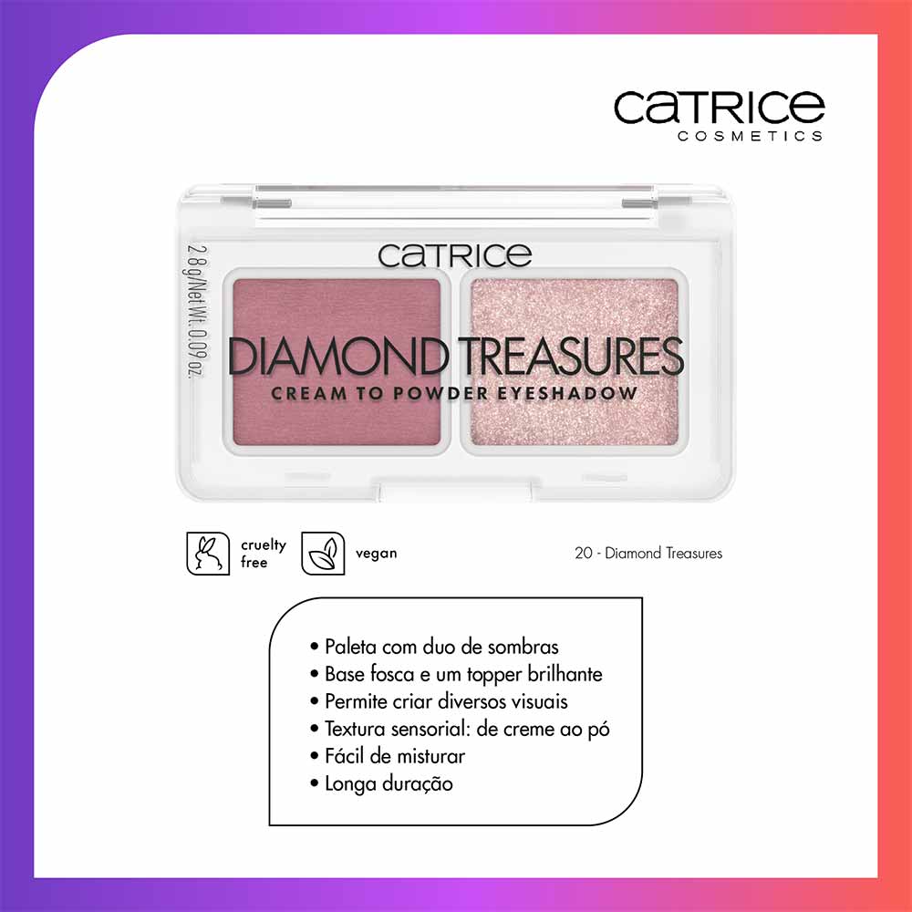 O Duo de Sombras Catrice Diamond Treasures é uma paleta compacta para maquiagem dos olhos, desenvolvida para criar looks versáteis e sofisticados.