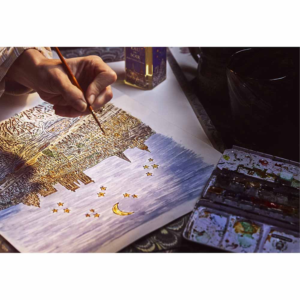 A elegância do frasco reflete a composição olfativa desta fragrância atemporal, na qual o frescor dos cítricos se une à sensualidade das flores, criando um rastro chipre refinado. Adornada com estas ilustrações encantadoras, Eau du Soir adquire um charme moderno e único.