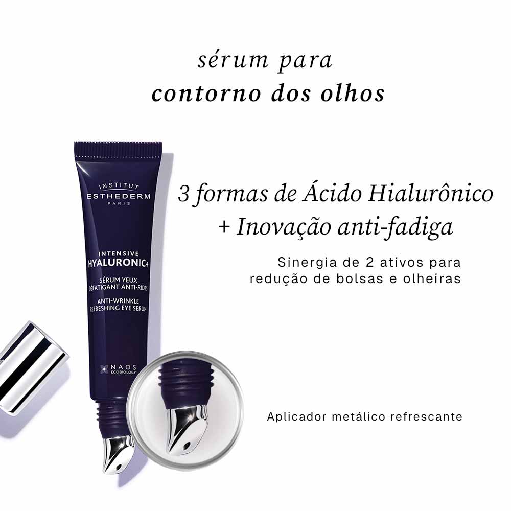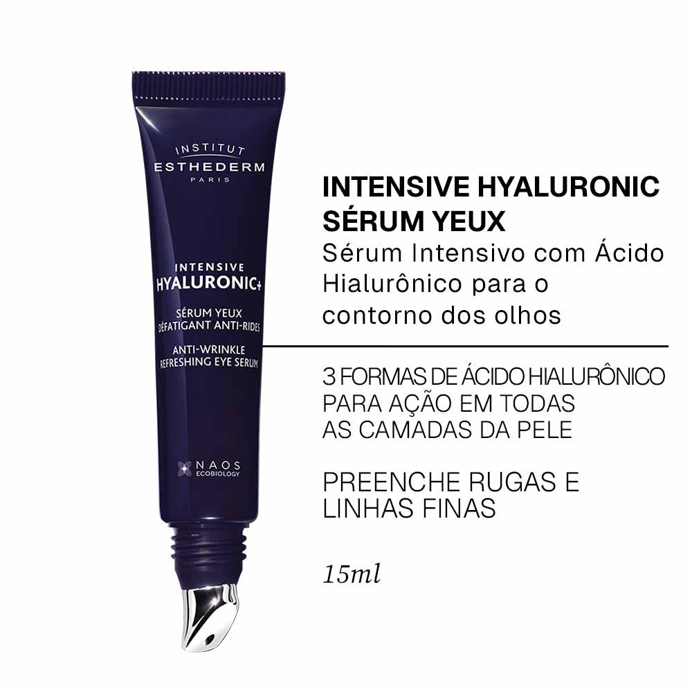 Intensive Hyaluronic Sérum Contorno dos Olhos é um novo gesto de beleza que dá volume, preenche e hidrata o contorno dos olhos. Ele devolve o volume nas partes fundas das olheiras e visivelmente suaviza as rugas na área dos olhos. Possui uma combinação de três ativos descongestionantes (Cafeína, Ruscogenina e Carnosina) que ajudam a reduzir as olheiras e o inchaço (bolsas) na região dos olhos.
