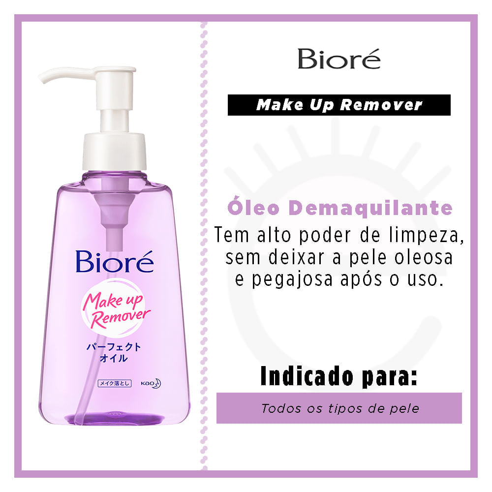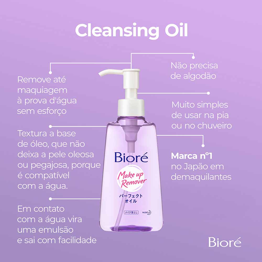 Óleo Demaquilante Facial Bioré - Cleansing Oil O que é e para que serve? Óleo de Limpeza Bioré Demaquilante remove completamente toda e qualquer maquiagem, incluindo máscara à prova d’água, delineador, batom e base. Não deixa resíduos e nem sensação de pele oleosa após o uso. Última tecnologia em demaquilantes que remove a maquiagem até mesmo com as mãos e o rosto molhados. É um inovador produto de limpeza facial desenvolvido especialmente para atender às necessidades das mulheres brasileiras apaixonadas por beleza e skincare. Sua tecnologia exclusiva forma camadas laminares que garantem uma dissolução eficaz dos produtos cosméticos, deixando sua pele incrivelmente limpa sem resíduos indesejados. Quais os Benefícios do Óleo Demaquilante Bioré? - Remove eficientemente até as maquiagens mais pesadas com facilidade; - Formulado para não deixar a pele com aspecto pegajoso ou oleoso após o uso; - Pode ser usado tanto no rosto seco quanto molhado, ideal para uso durante o banho; - Dispensa o uso de algodão e sai facilmente com água corrente; - Desenvolvido com ingredientes compatíveis com água, oferece cuidado superior sem comprometer a saúde da sua pele. Modo de Uso: 1. Aperte a haste para bombear o produto por 4 vezes direto na mão (não utilize algodão). 2. Aplique no rosto massageando suavemente para remover a maquiagem, inclusive máscaras à prova d'água. 3. Pode ser aplicado durante o banho. O Óleo Demaquilante Bioré pode ser utilizado diariamente? Sim! O Óleo Demaquilante Bioré foi formulado pensando na delicadeza necessária para cuidados diários sem agredir a barreira natural da pele enquanto remove toda sujeira acumulada durante o dia — incluindo poluição urbana comum nos grandes centros urbanos brasileiros. Ele é indicado apenas para peles oleosas? Não necessariamente! Apesar deste produto ter sido projetado visando minimizar qualquer sensação gordurosa pós-limpeza (ideal também portanto p/ quem tem tendencia acneica), ele atende perfeitamente outros tipos cutâneos pois respeita equilíbrio hídrico essencial mantendo hidratação saudável independente do seu tipo de pele. Código ANVISA: 25351.283300/2019-8