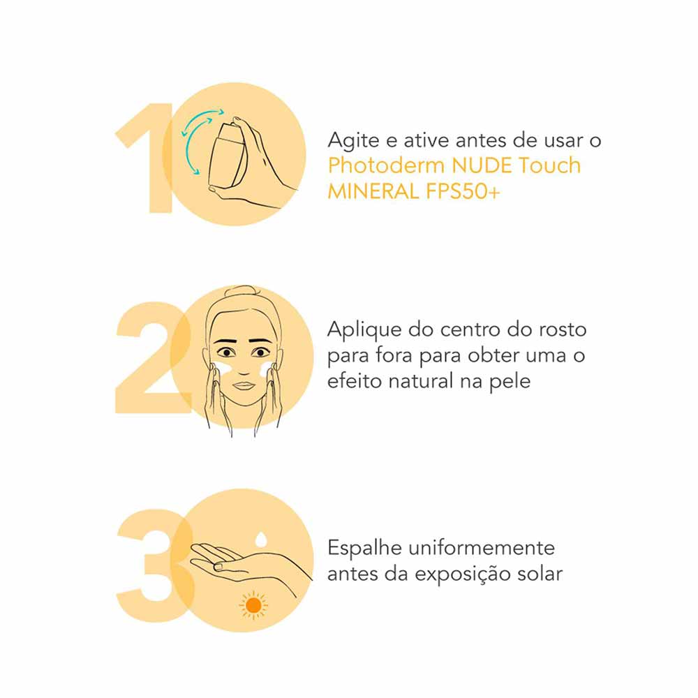 Photoderm Nude Touch FPS 50+ é o 1º protetor solar 100% físico especialmente desenvolvido para peles oleosas. Sua fórmula bifásica oferece o melhor da fotoproteção 100% mineral, garantindo um verdadeiro escudo protetor fotoestável por 08h¹ mesmo em condições extremas², associado ao cuidado diário contra os sinais da pele oleosa. Dia após dia, Photoderm Nude Touch FPS 50+ reduz duradouramente a oleosidade através da patente Fluidactiv™; afina a textura da pele com a ação do ácido salicílico; e ainda previne o surgimento de cravos e espinhas, graças ao ativo capriloil glicina. Textura inovadora: Fórmula bifásica que associa filtros e pigmentos 100% minerais à fase líquida, reunindo o melhor da fotoproteção 100% física ao cuidado antioleosidade diário. Benefícios: Ao agitar, ambas fases se unem para criar uma textura ultra leve e fluida com espalhabilidade perfeita, cobertura natural e toque aveludado que não pesa e não derrete ao longo do dia. Aplique a partir de 8 gotas para garantir os 8 benefícios de Photoderm Nude Touch.