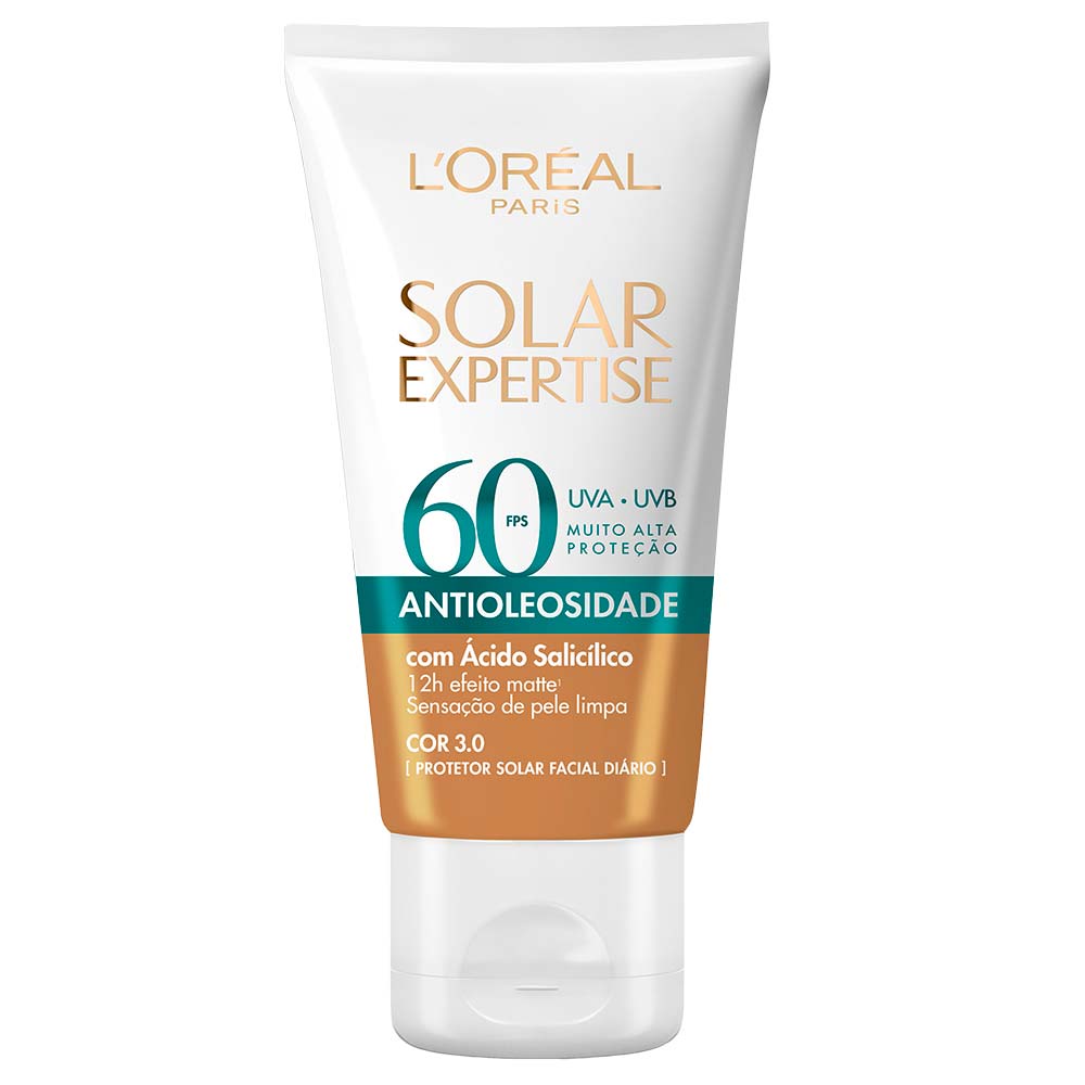 O NOVO L’ORÉAL PARIS SOLAR EXPERTISE Antioleosidade FPS 60 é um protetor solar facial de uso diário desenvolvido especialmente para peles oleosas. Sua fórmula possui filtros solares de altíssima eficácia que entrega alta proteção contra os raios UVA/UVB e Ácido Salicílico, ativo muito utilizado por dermatologistas para reduzir o excesso de oleosidade, garantindo assim uma sensação de pele limpa com 12h de efeito matte e prevenindo o envelhecimento cutâneo provocado pela exposição ao sol (rugas e manchas solares). Além de alta proteção UVA/UVB contra os efeitos do sol, possui textura leve e fácil de espalhar. Sua fórmula com Ácido Salicílico de alta tecnologia controla a oleosidade com efeito matte 12h, possui rápida absorção oil-free e resistência à água. BENEFÍCIOS: - Uniformiza a pele com cobertura com cor - Controla a oleosidade. 12h de efeito matte. - Textura leve, fácil de espalhar e oil free. - Alta proteção contra raios UVA e UVB - Previne o envelhecimento solar - Previne rugas e manchas solares - Previne contra queimaduras de sol - Reduz o brilho - Rápida absorção
